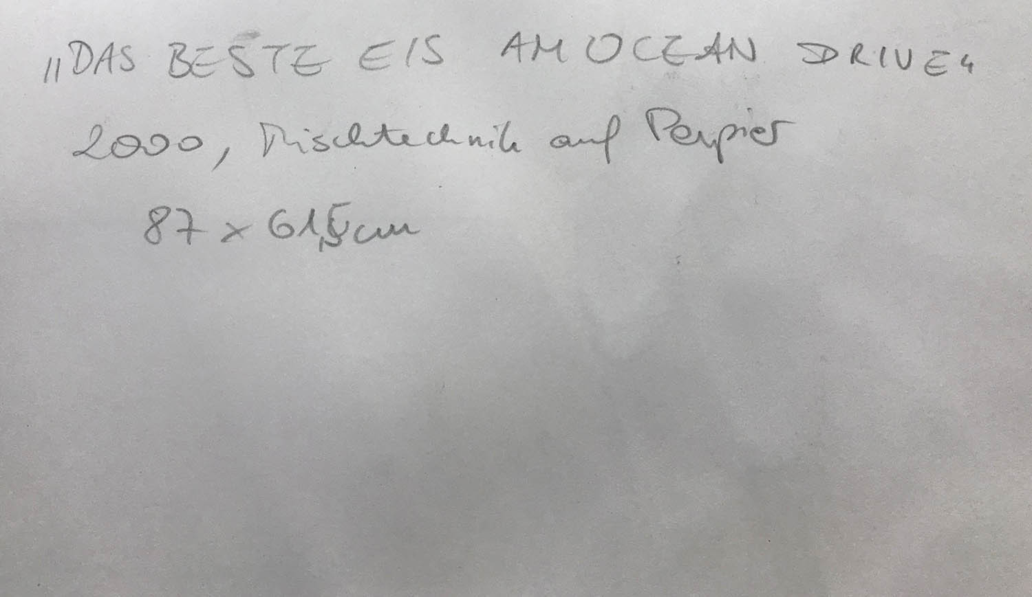 - verso: signed and dated: "Maximilian Otte 2000"; inscribed: "Das beste Eis am Ocean Drive, 2000, Mischtechnik auf Papier, 87 x 68.5 cm