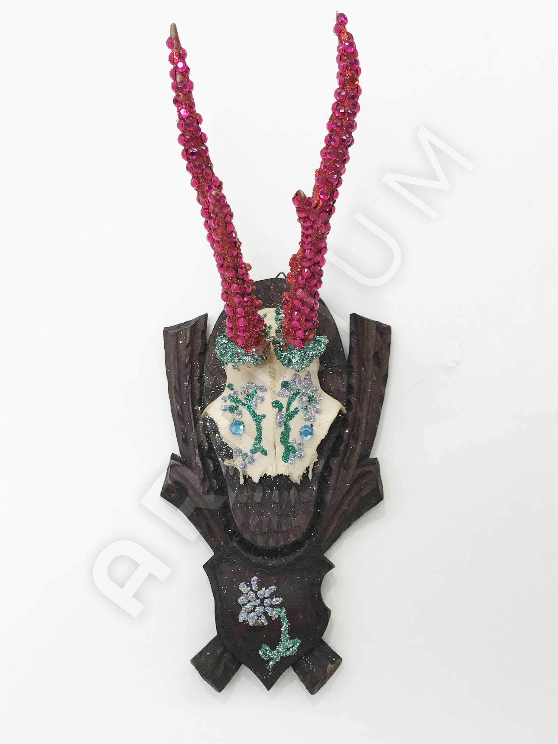 Mischtechnik, Diamantstaub, Glaskristalle auf Jagdtrophäe