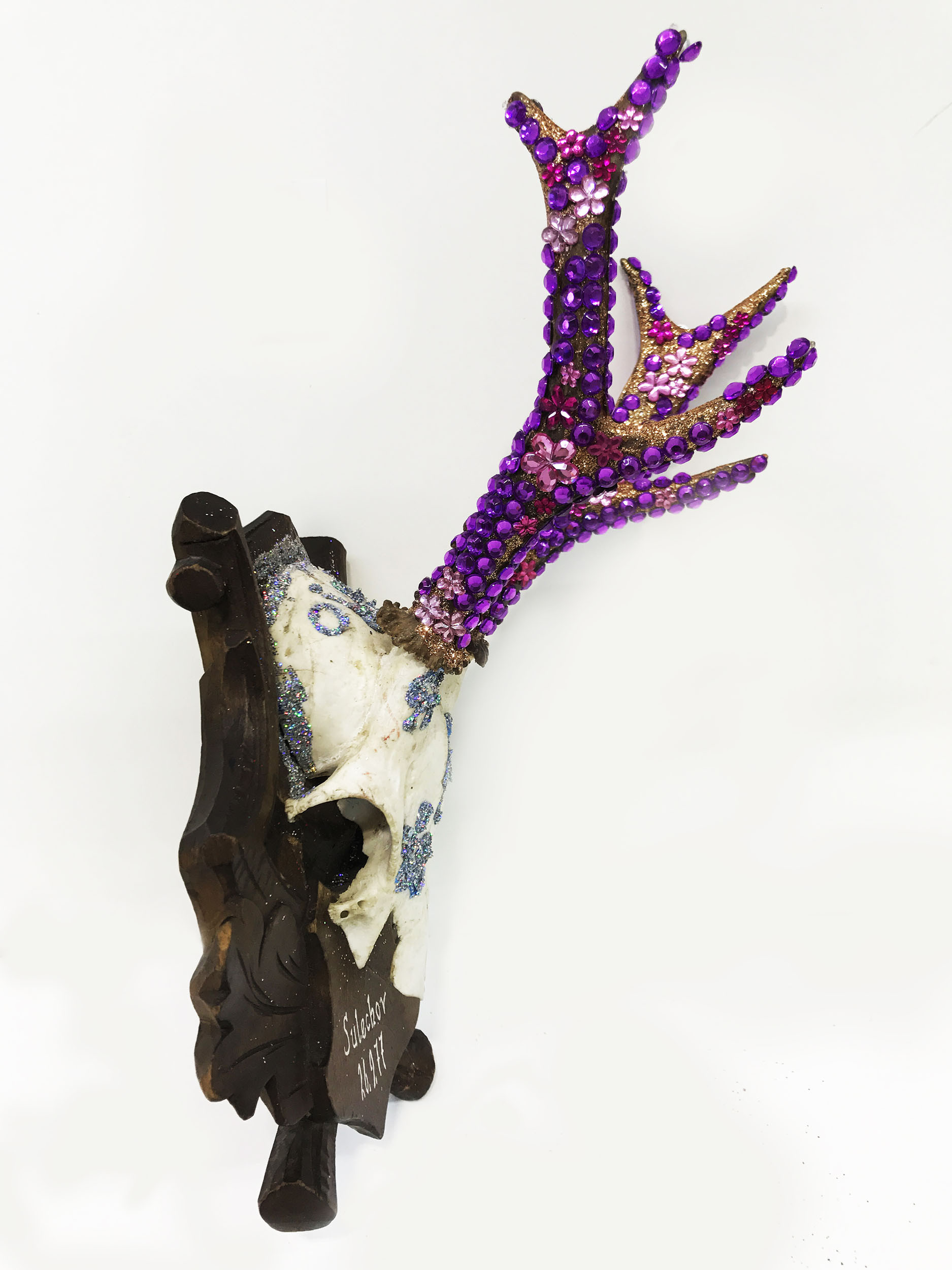 Mischtechnik, Diamantstaub, Glaskristalle auf Jagdtrophäe
