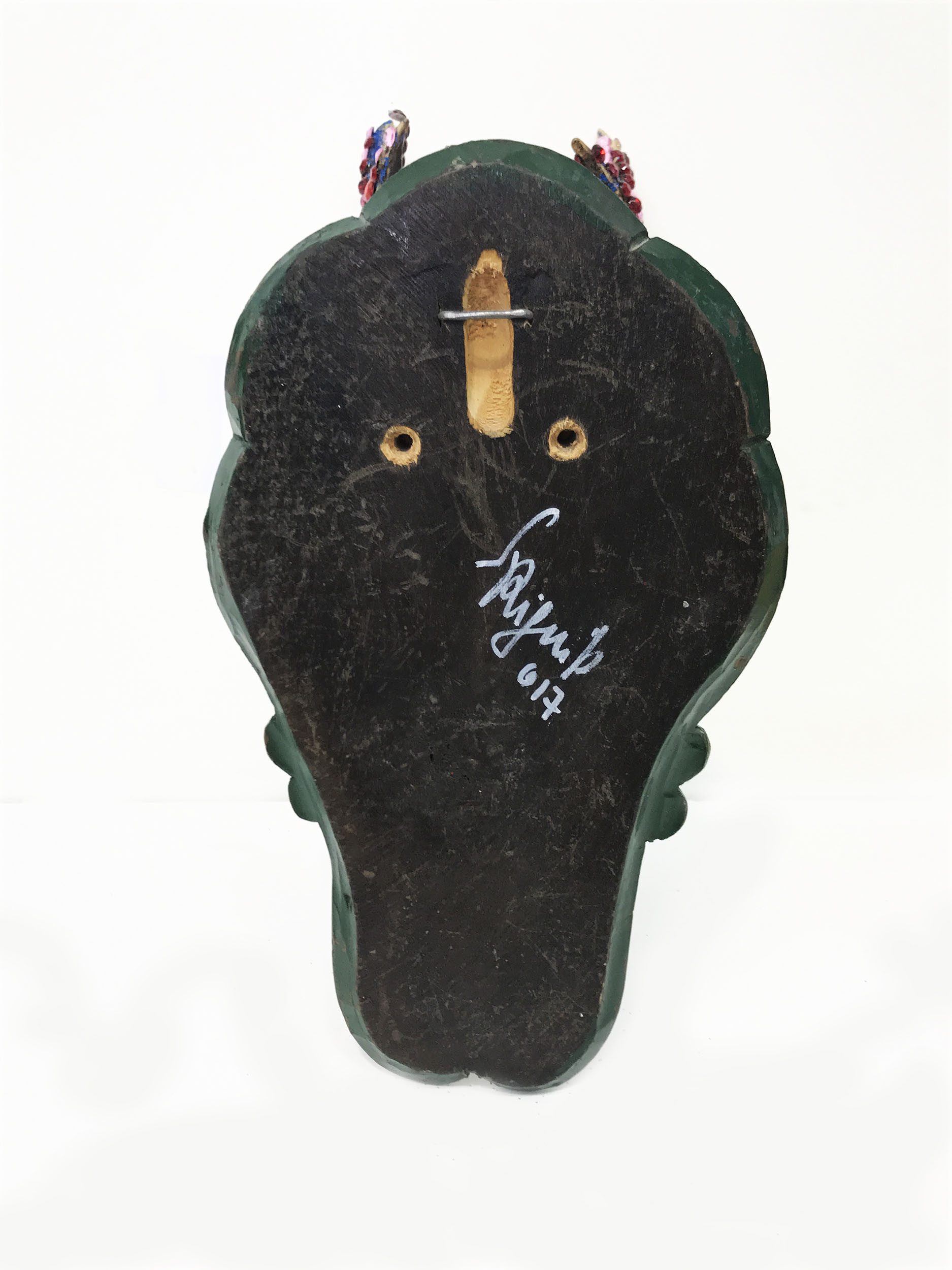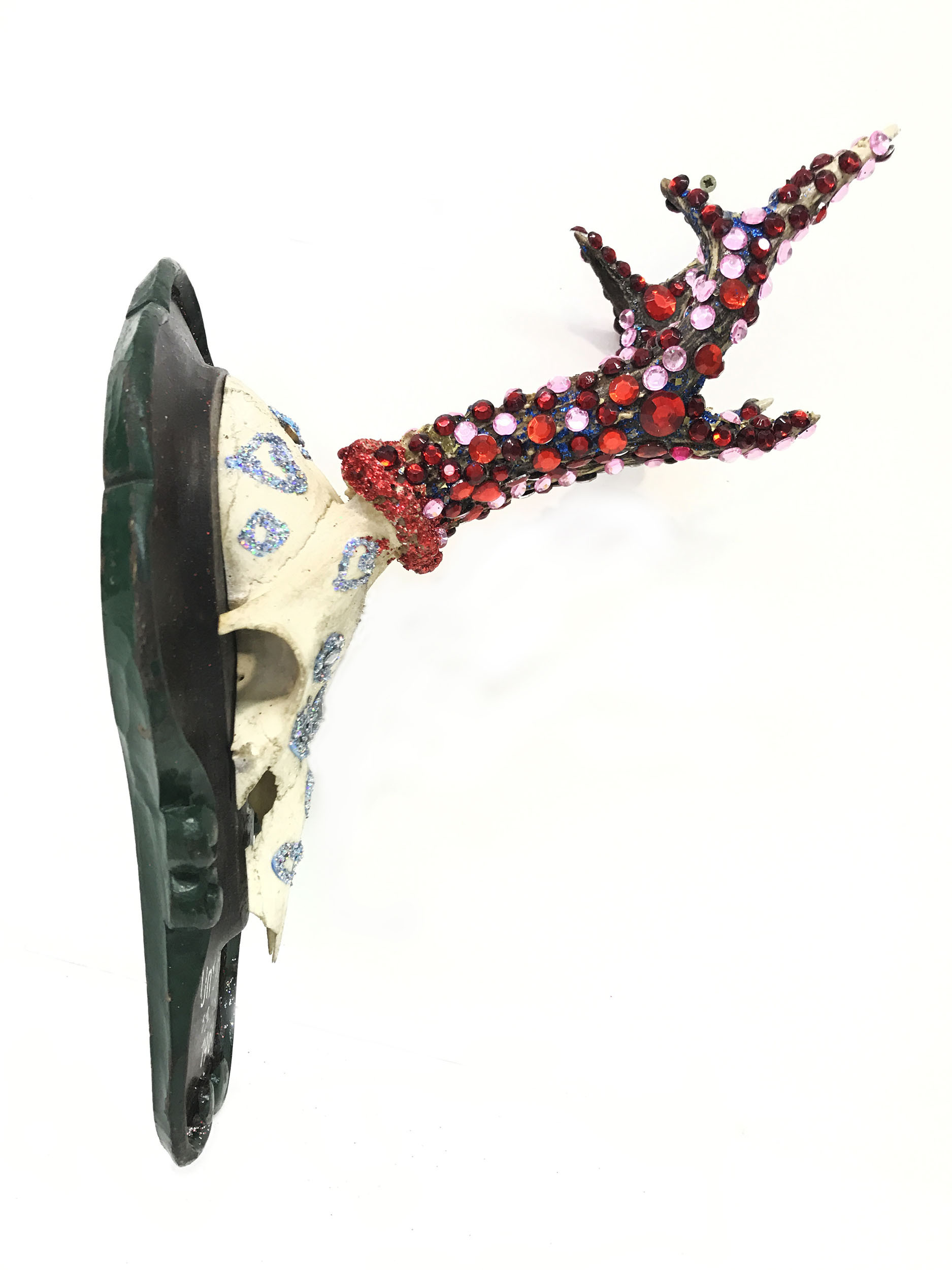 Mixed media, diamond dust, glass crystals on hunting trophy