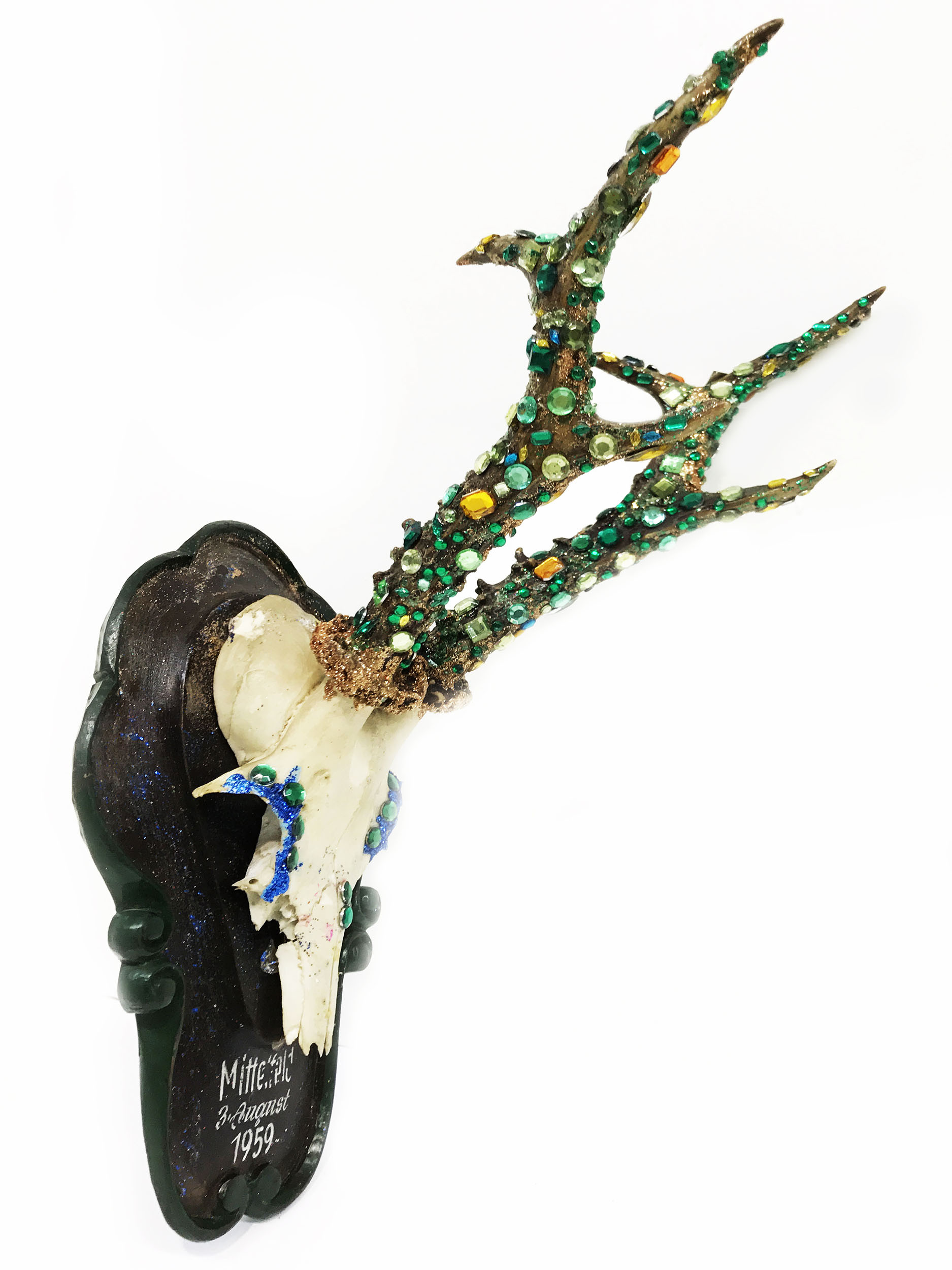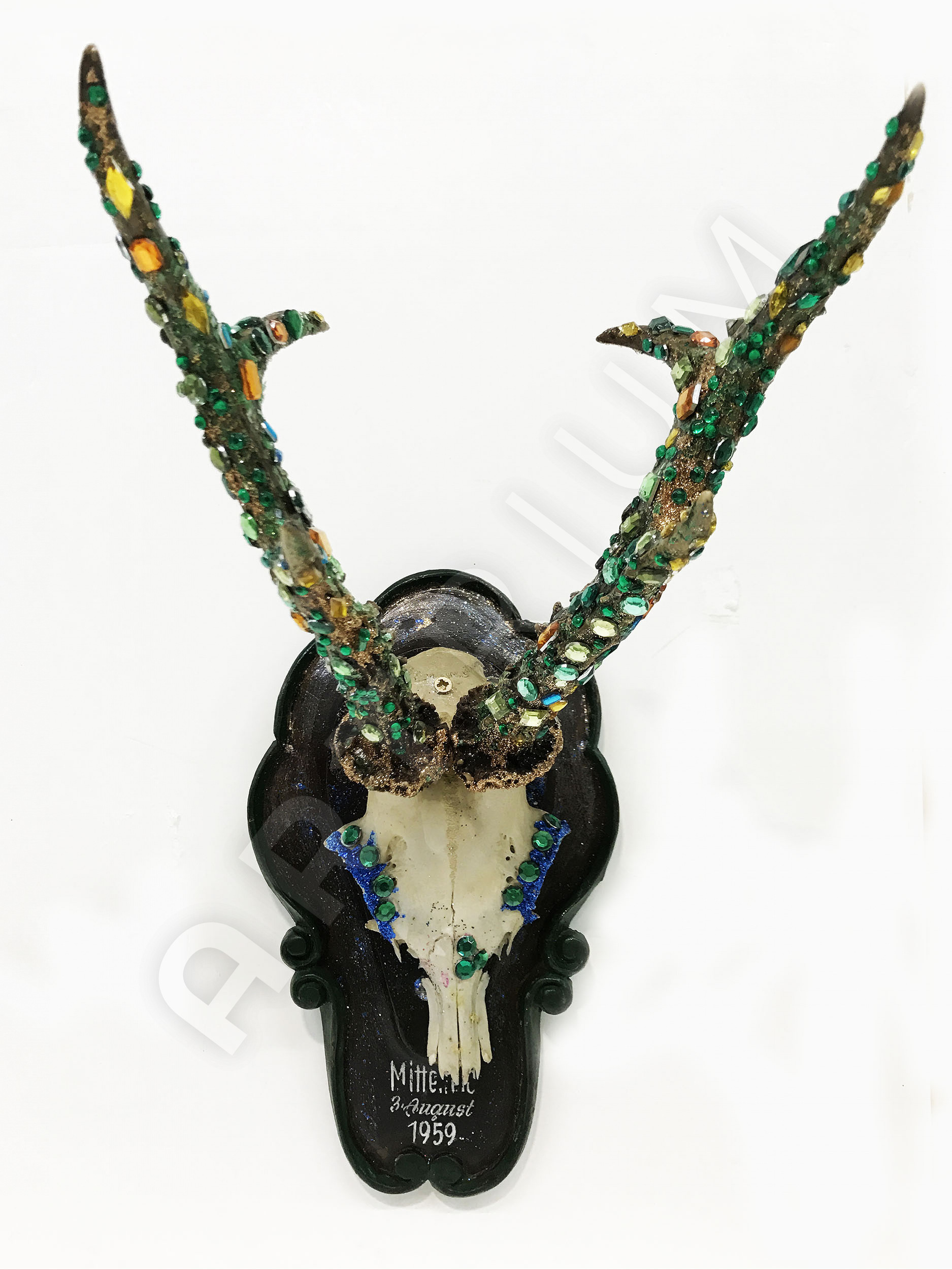 Mischtechnik, Diamantstaub, Glaskristalle auf Jagdtrophäe
