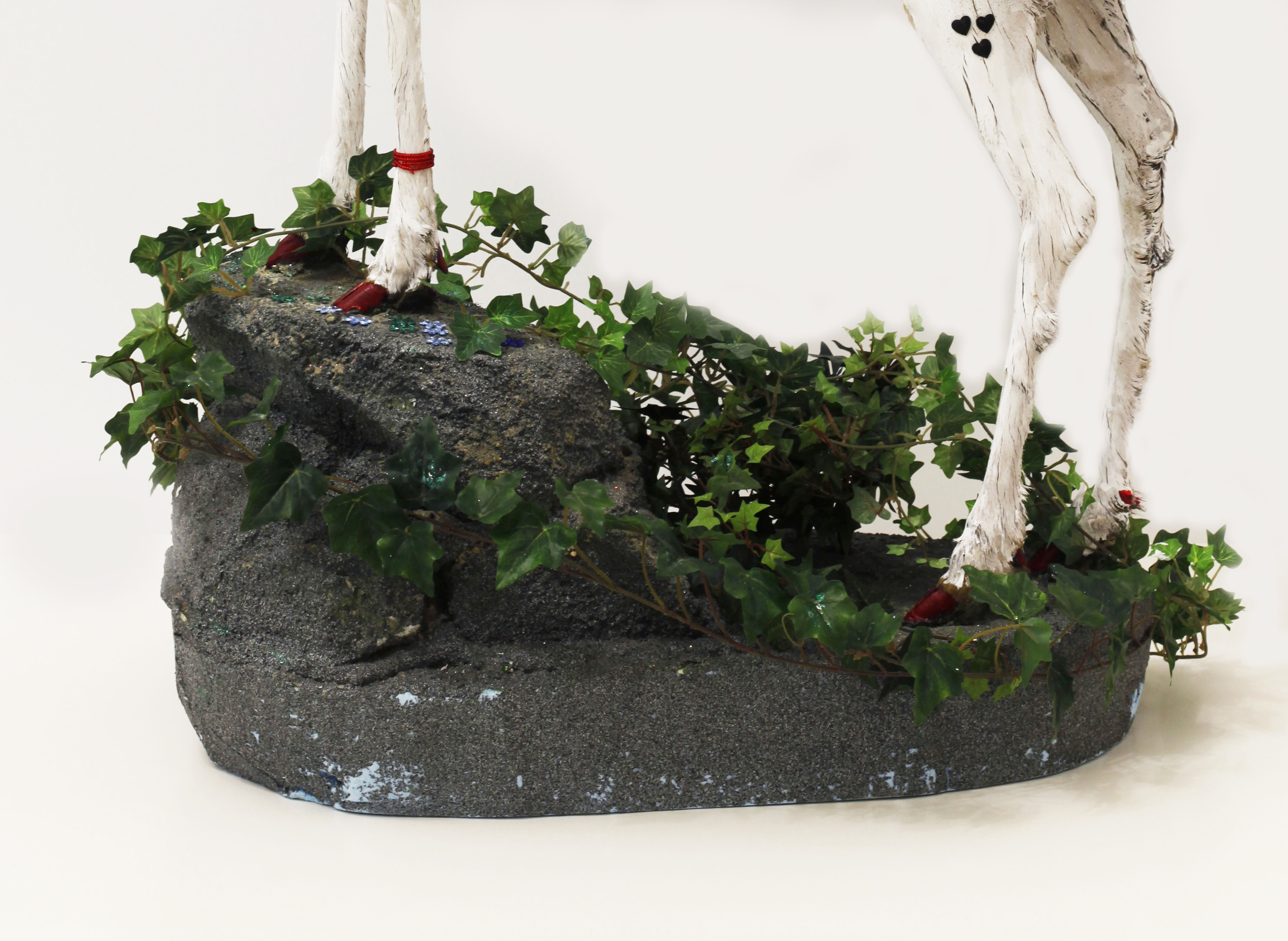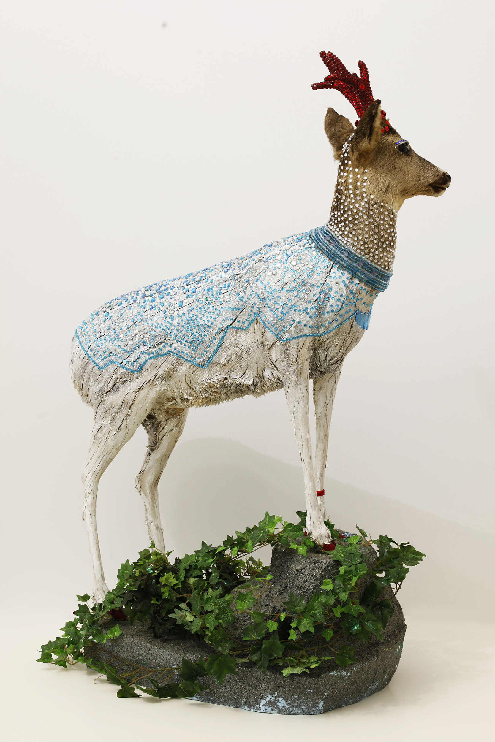 Mischtechnik, Diamantstaub, Glaskristalle auf präparierte Rehbocktrophäe