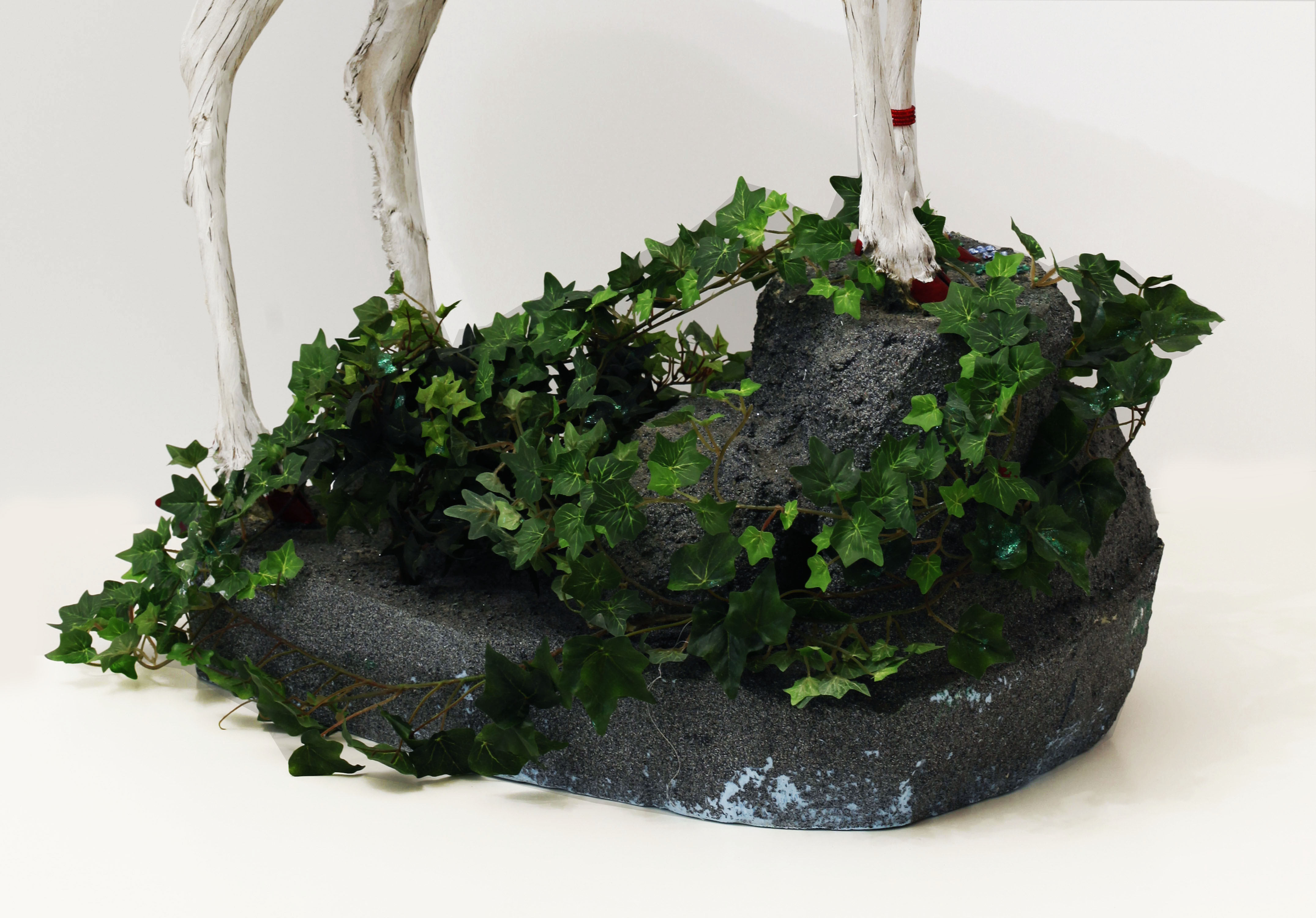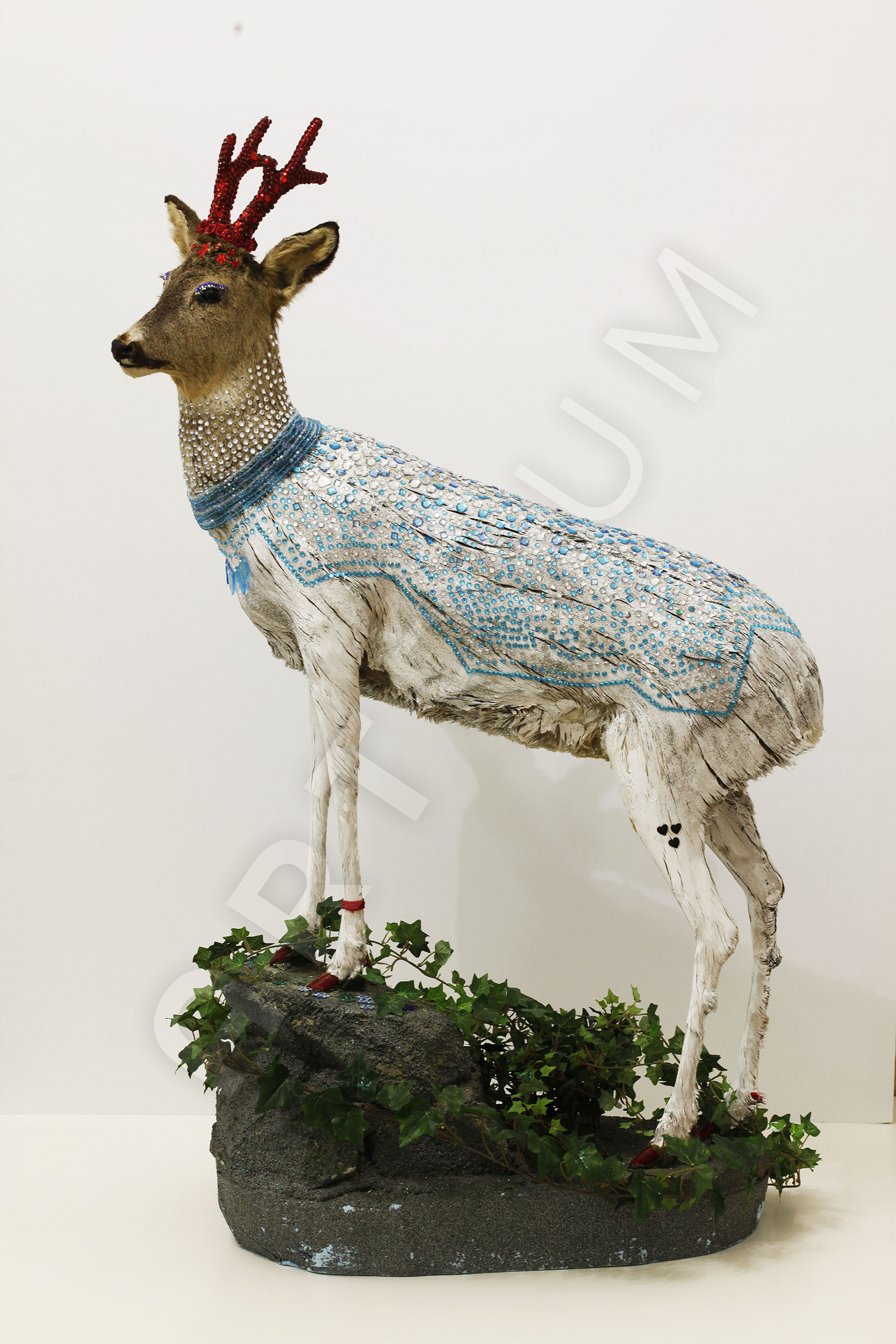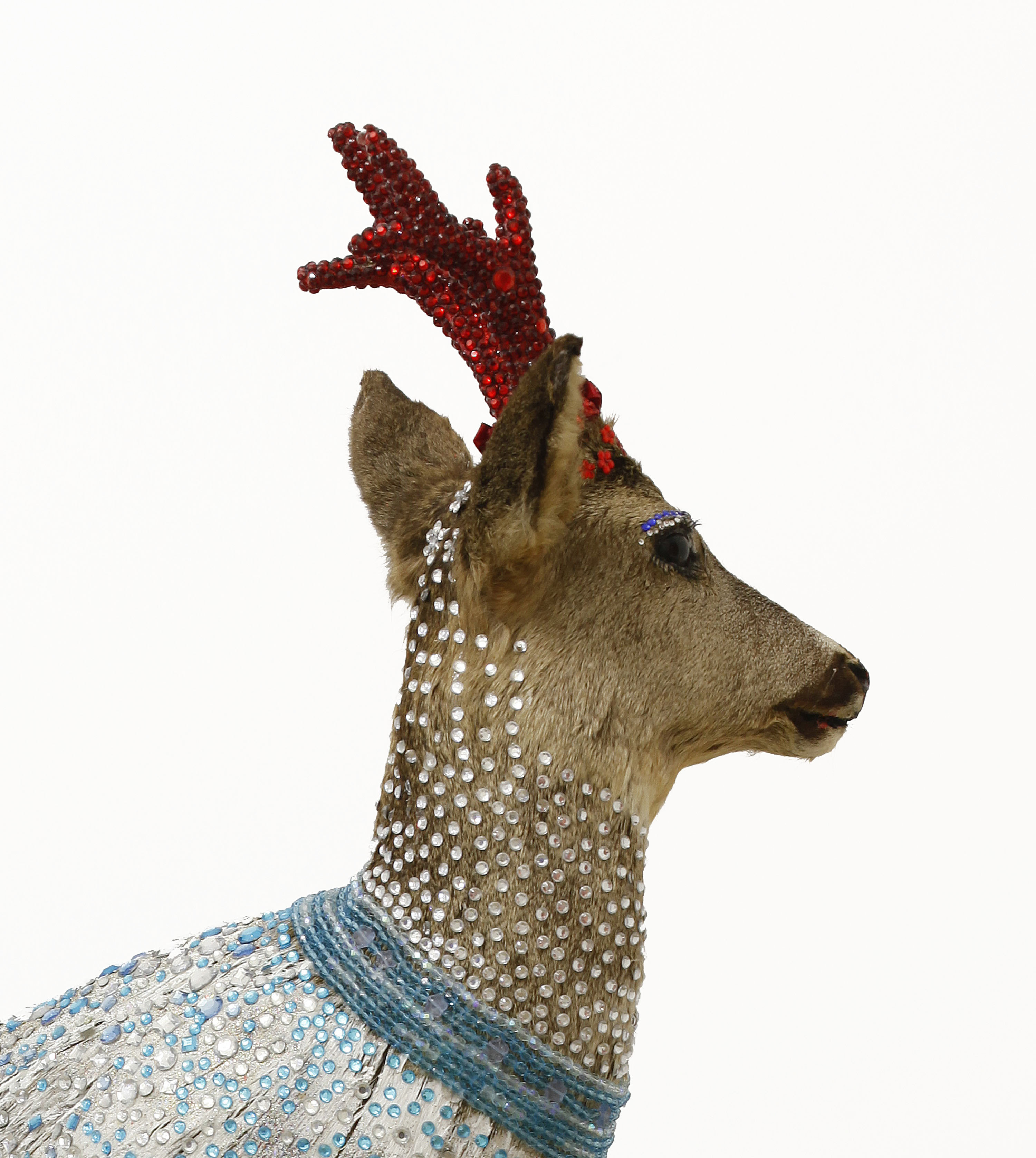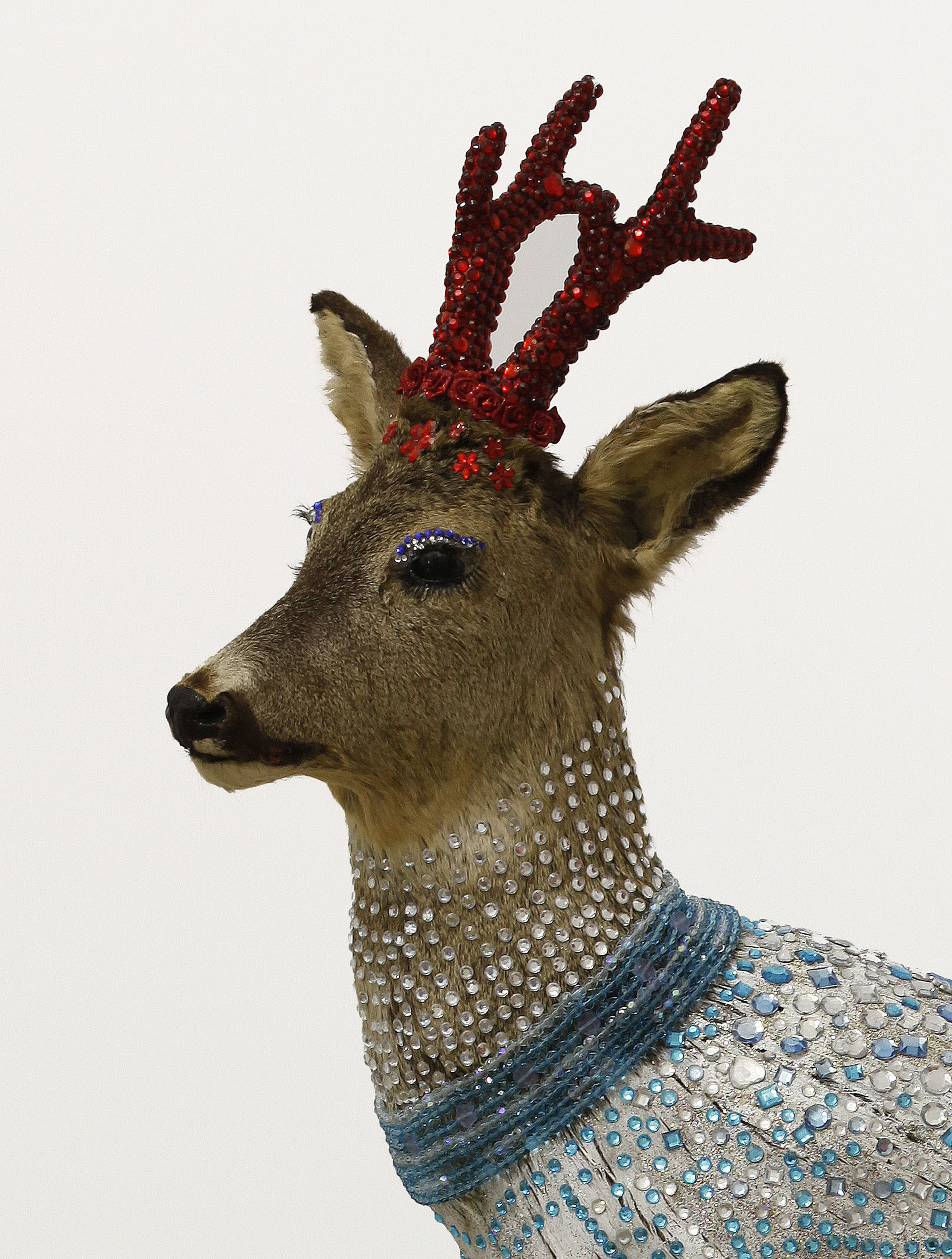 Mixed media, diamond dust, glass crystals on Roebuck trophy