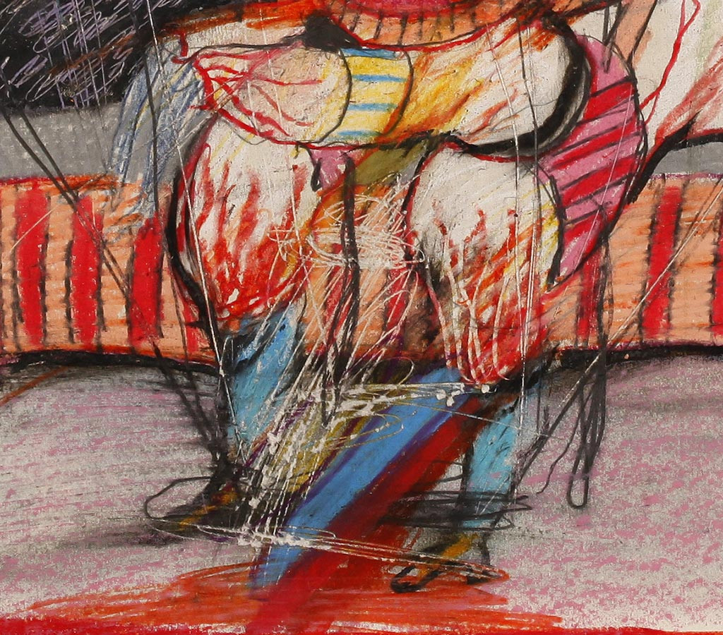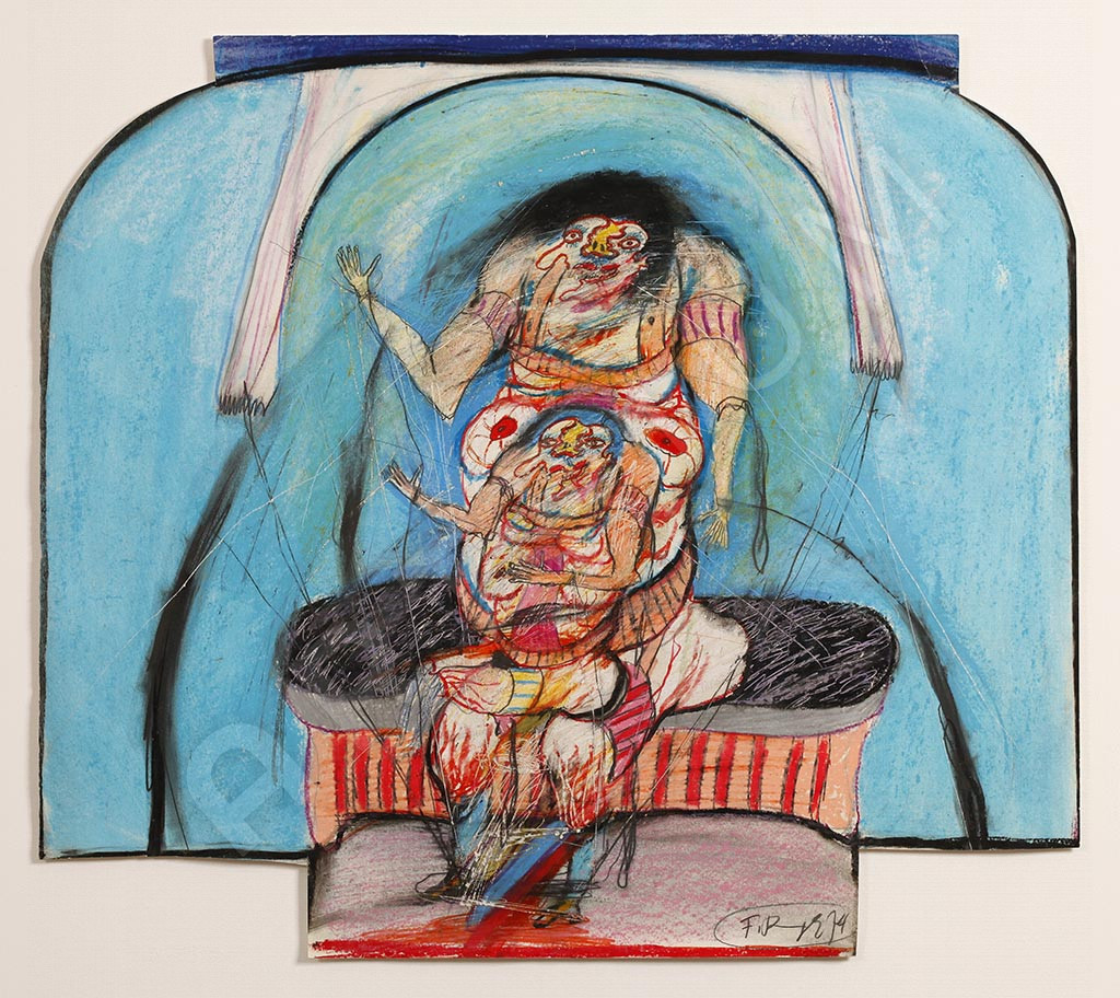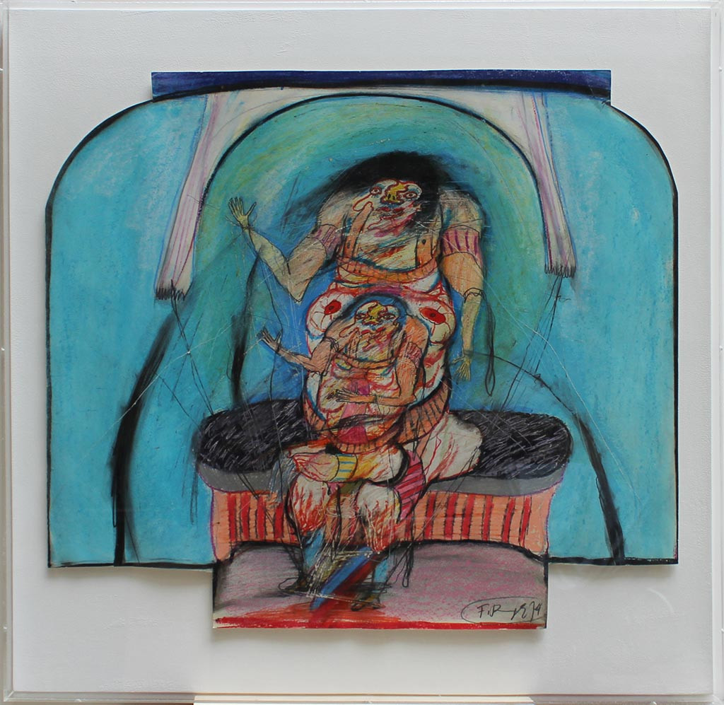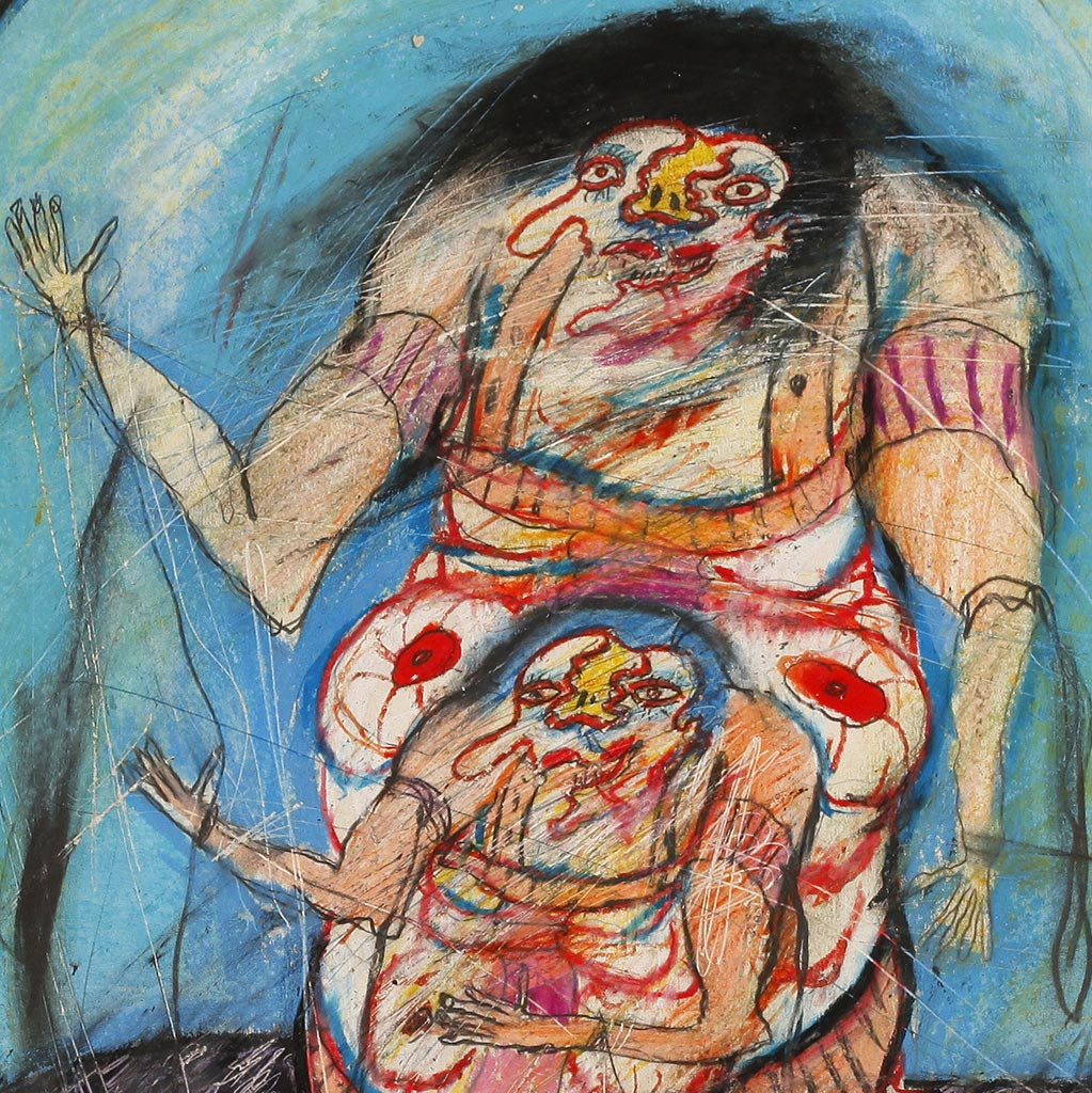 - Er war Gründungsmitglied der Gruppe Wirklichkeiten und malte gewöhnlich menschliche Figuren, die Motive aus den Tiefen des menschlichen Unbewussten oder der klassischen griechischen Literatur darstellen. In den 70er Jahren setzt sich Ringel mit den Malereien der Geisteskranken und psychopathologischer Kunst auseinander. Seine starkfarbigen Gemälde, die meist einander durch Nabelschnüre verbundene "Zwitterwesen" darstellen, stehen der L'art brut und Dubuffet nahe. Diese Arbeit stammt aus der Serie hermaphroditischen Geschlechtermonster. Peter Gorsen nennt sie figurative Psycho-Malerei.