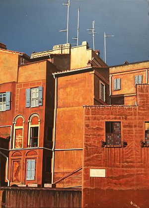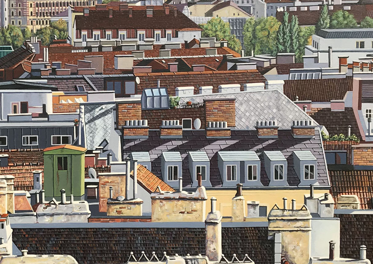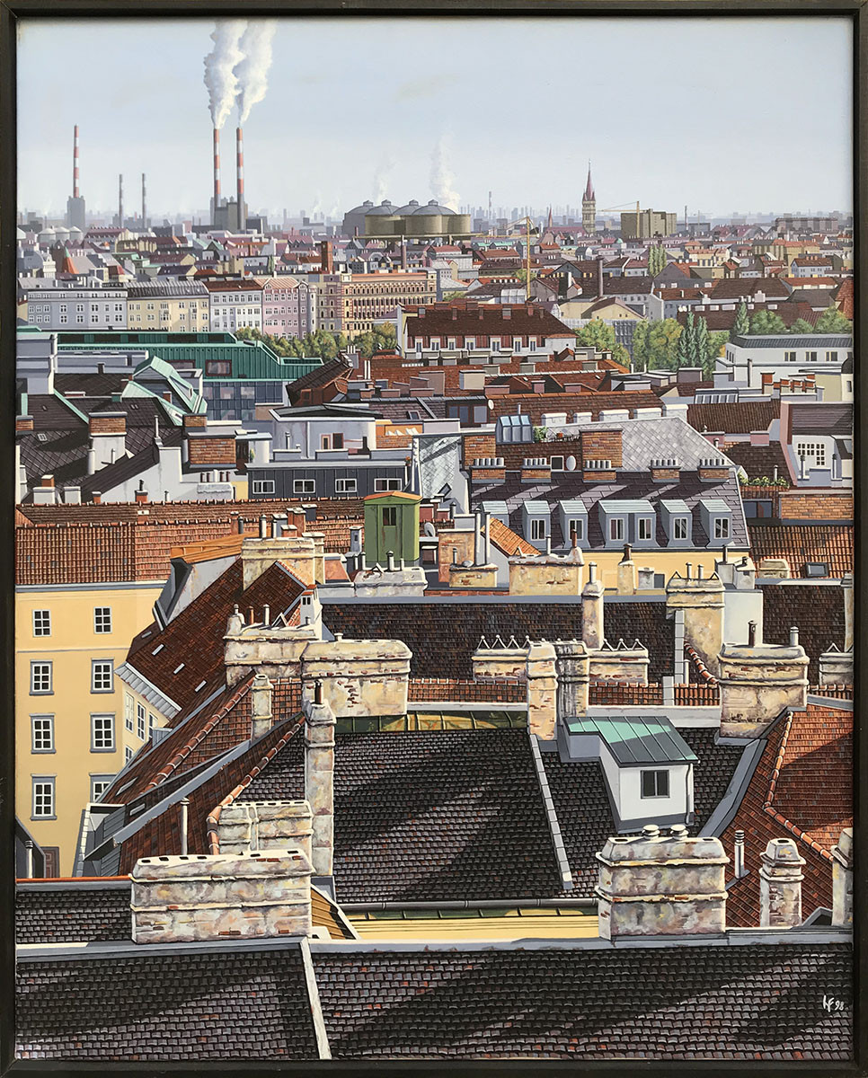 Vertreter des konzeptionellen Fotorealismus. Großstädtische Mobiliarsegmente - Wolkenkratzer, historische Baudenkmäler, Reklametafeln, Hinterhöfe, Fassaden, Dachlandschaften, Feuertreppen, Skulpturen im öffentlichen Raum, Gesimsarchitekturen - aber auch Strukturen der Architektur und der Natur im ländlichen Umfeld sind die Themen, denen sich der Künstler annimmt. Frauendorfer lotet dabei die Möglichkeiten aus, die sich aus einem unkonventionellen Blickwinkel ergeben. Seine markante Wahl der Motivausschnitte und ein bewusster Umgang mit Licht und Schatten zeichnen seine Bilder aus. Sie vermitteln dem Betrachter eine faszinierende Welt, in der die Grenzen von Schein und Wirklichkeit, von Realität und Phantasie aufgehoben scheinen.