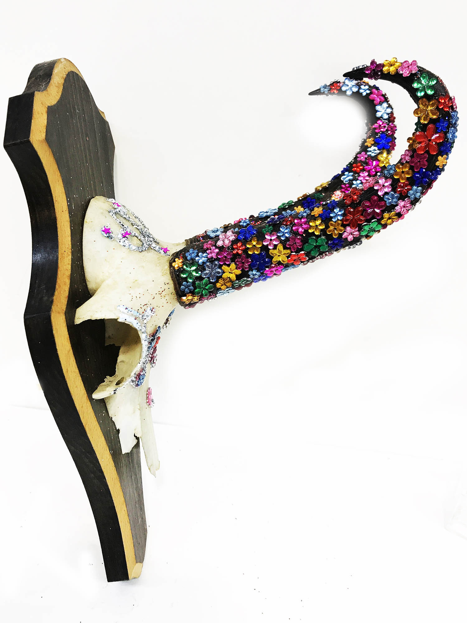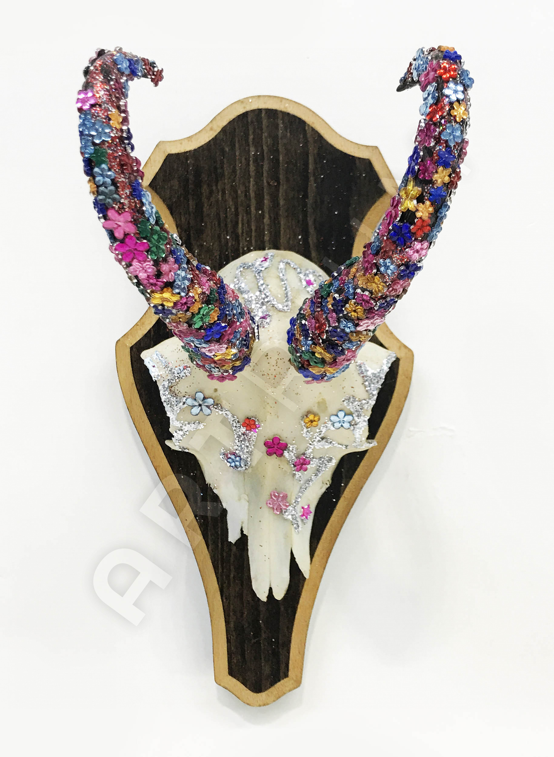 Mischtechnik, Diamantstaub, Glaskristalle auf Jagdtrophäe