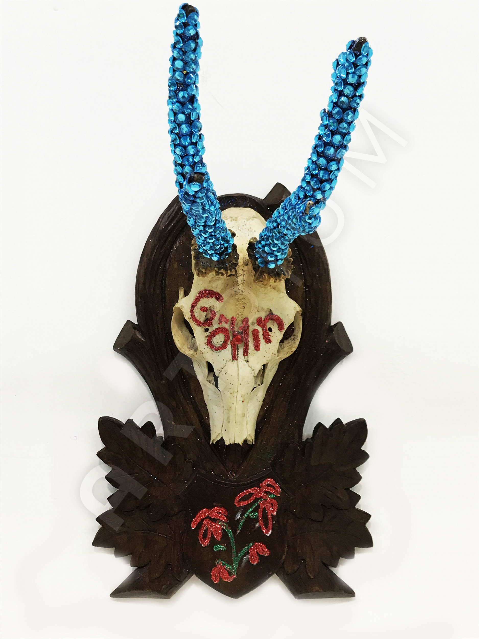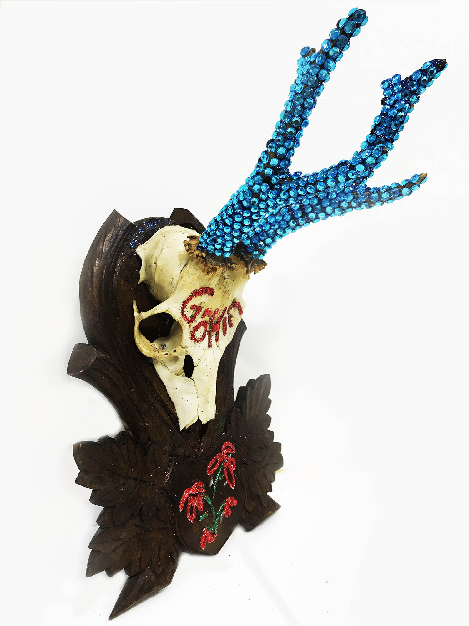 Mischtechnik, Diamantstaub, Glaskristalle auf Jagdtrophäe