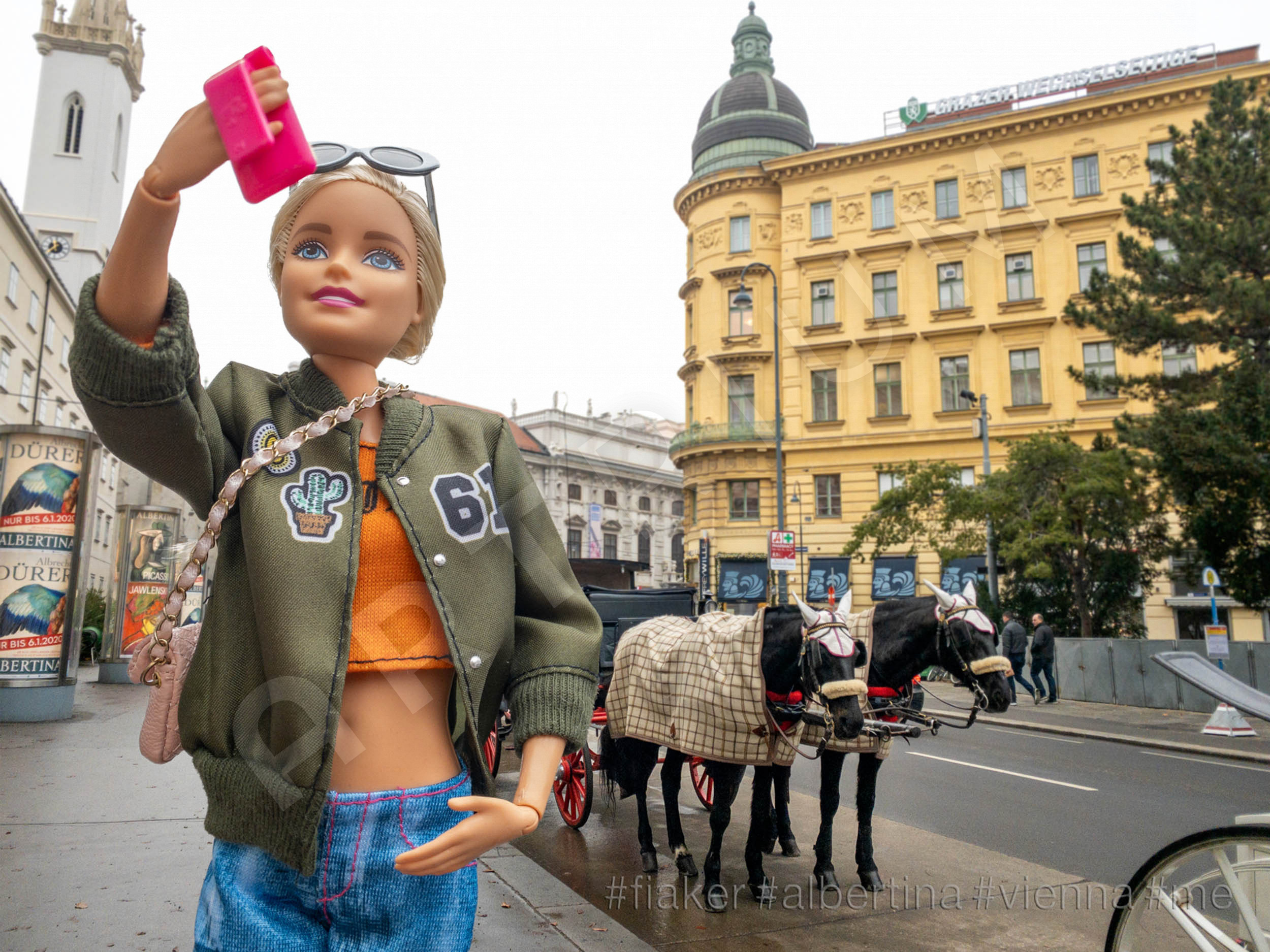 Die konzeptuelle Fotografin Kathrin Hoyos macht Barbie zur Protagonistin ihrer Fotoserie #me, in der sie diesen Zusammenhang der jüngeren Lifestyle-Standards, der Konsumkultur und der Medienbedingungen der paradoxen Social Media Individualität anschaulich macht. So lebendig sie nach Jahrzehnten der Präsenz für uns wirken mag, so bleibt Barbie doch eine Puppe mit vorgeformtem Lächeln, aus Kunststoff und mit steifen Gliedern, die genau weiß: wer heute neidvolle Blicke auf sich ziehen will, kann nicht mehr allein mit Cabrio, Markenaccessoires und langen Beinen im Minirock punkten. Als echtes Jet-Set-Girl sammelt Barbie heute - sei es in Kapstadt, Monte Carlo, Paris, Venedig oder Wien - mit ausgestrecktem Arm in Selfie - Pose Likes und Follower. Die instagramisierten Top-Sights des Globus, die Experiences und Events unseres aufregenden Lebens, sind die Lifestyle-Währung der Gegenwart. Durch Barbie als Darstellungsmittel gelingt der in Südafrika und Monaco lebenden Künstlerin eine durchaus unangenehme Reminiszenz an die mechanische Bereitwilligkeit, mit der wir uns den Prinzipien der Selbstinszenierung unterwerfen und eine Mahnung an die Bestechlichkeit unserer Sinne durch die Darstellung von scheinbar einmaligen Traumstränden, Wahrzeichen, Bergblicken und Begegnungen, für die wir in Wirklichkeit massenhaft und schamlos Schlange stehen müssen.
