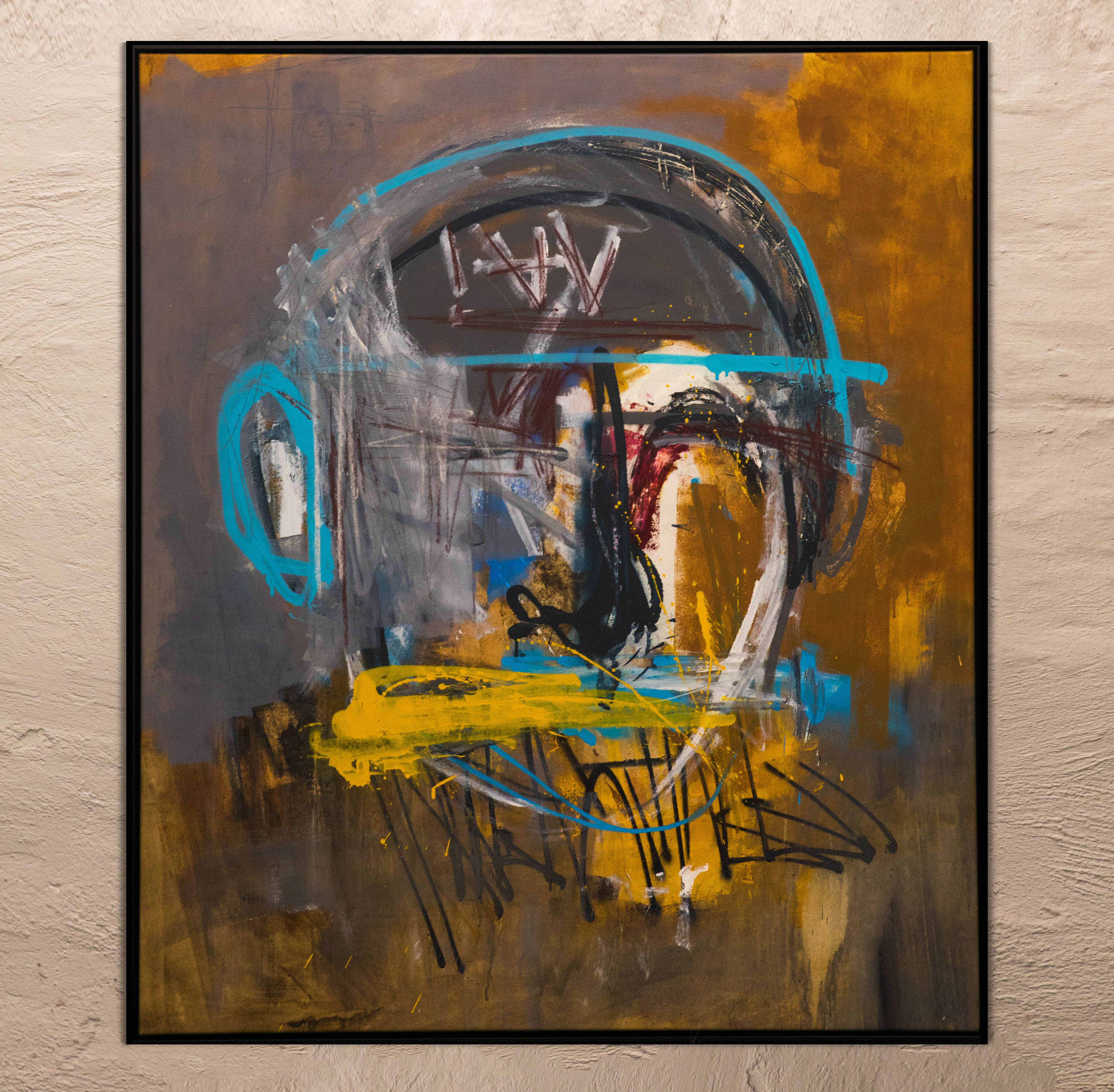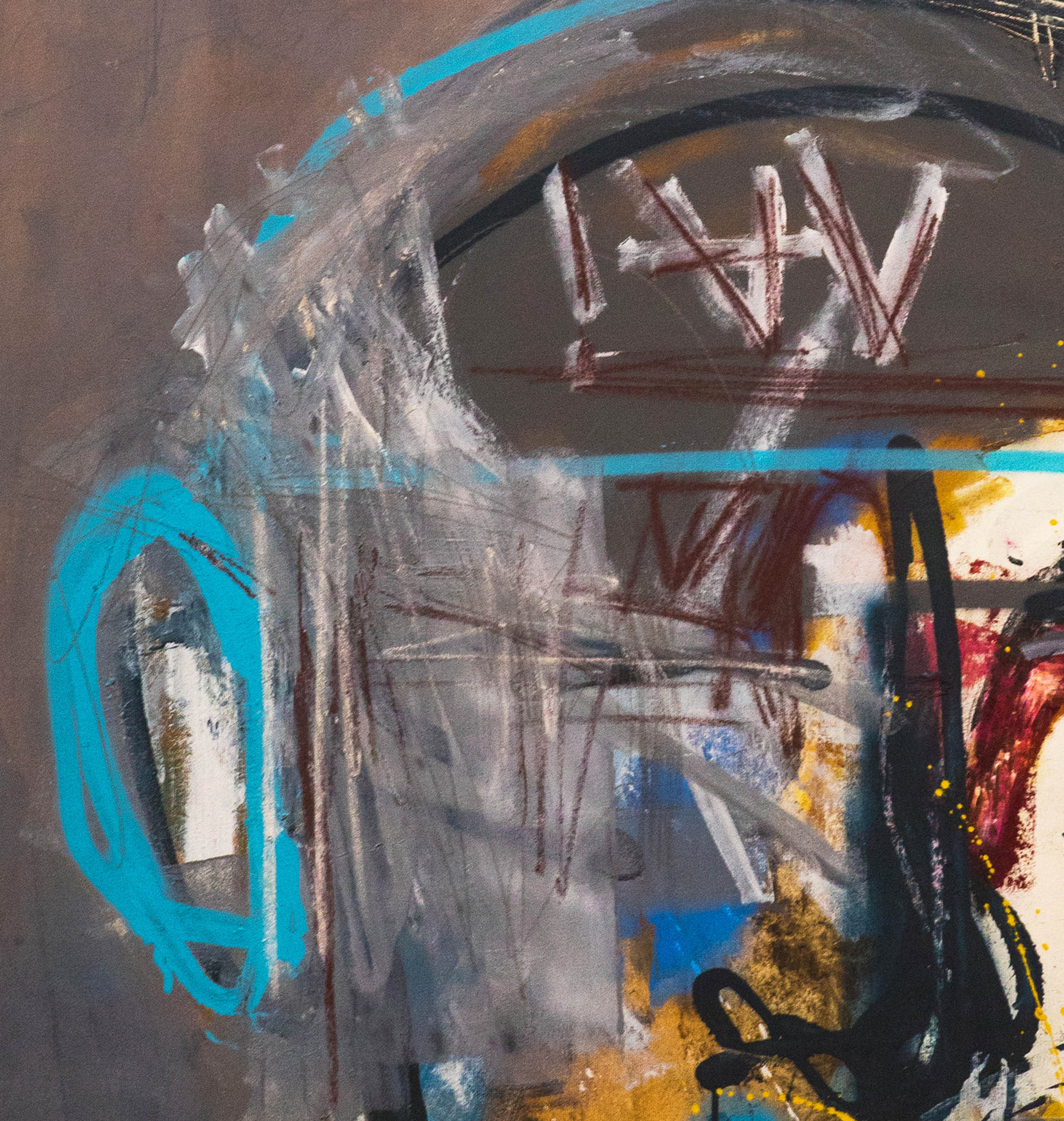 Acrylic, crayons, graffiti, oil and spray on canvas