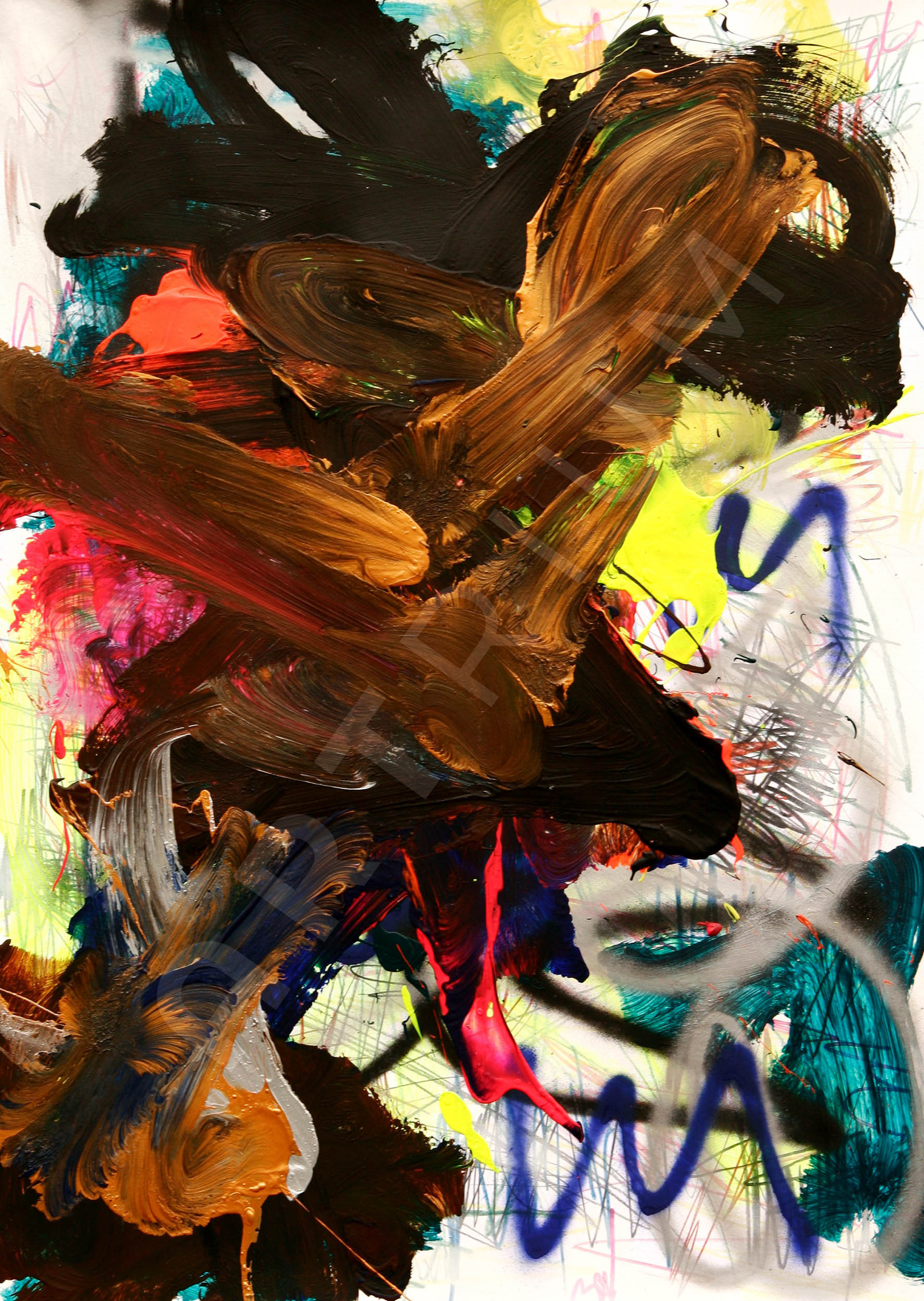 Acryl, Sprühfarbe und permanent Marker auf Papier