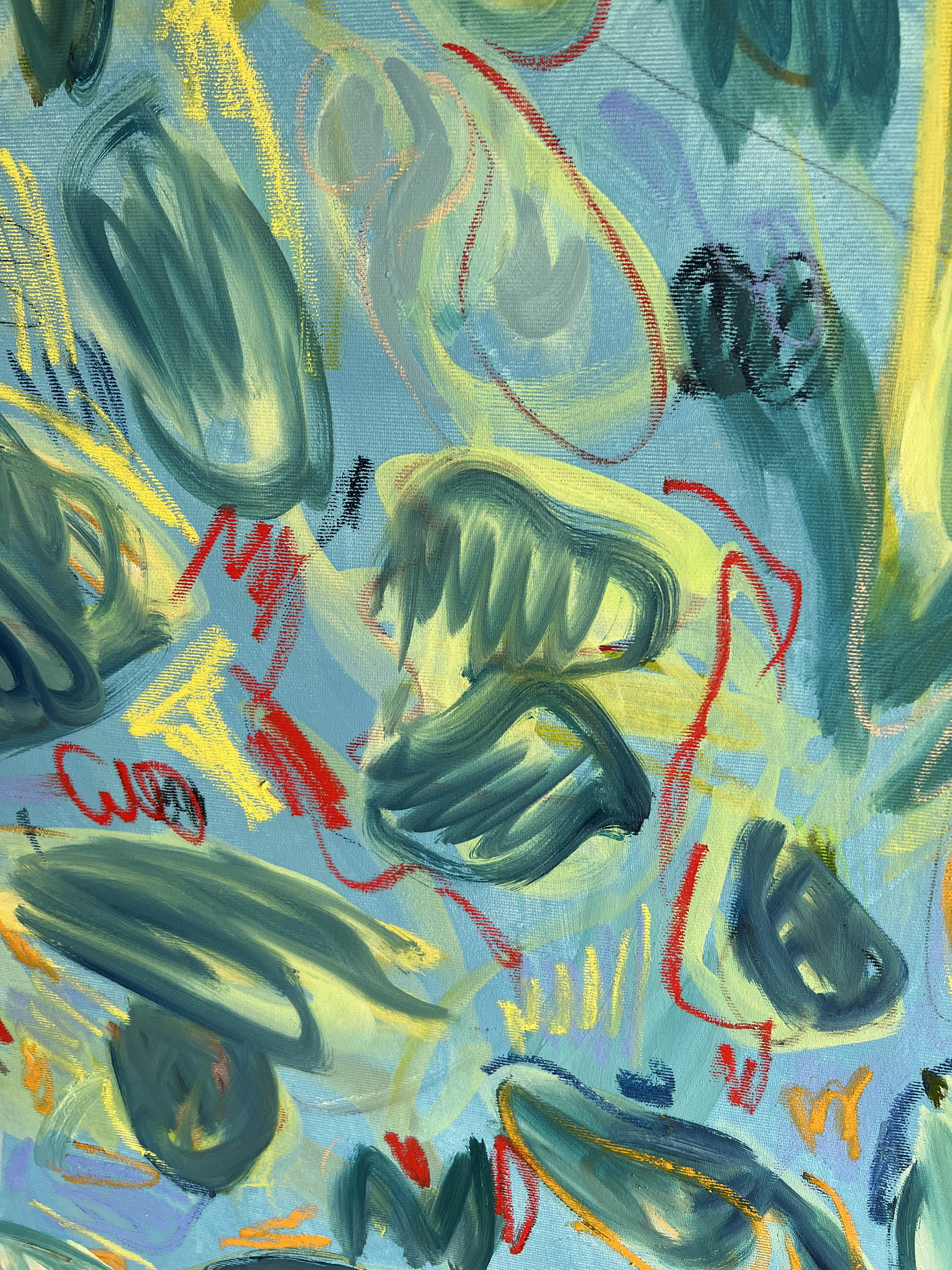 Kalina Horon (*1992) ist eine Malerin aus Polen, die seit 2014 in Wien lebt und arbeitet. In ihrer aktuellen Malpraxis entdeckt sie die Möglichkeiten einer abstrakten Bildsprache, die auf freier Improvisation beruht. Ausgehend von ihrem Wissen über Kompositionsregeln und die Theorie der Farbkombination schafft sie Bilder, in denen alle Formen miteinander korrespondieren, sich gegenseitig anstecken, um eine endgültige, perfekt ausgewogene Struktur zu bilden und den Betrachter ästhetisch zu beeinflussen. Sie sieht ihre Werke als eine Visualisierung von Spannungen, die in der Welt und in der Gesellschaft auftreten. Sie schloss 2016 ihr Studium an der Akademie der Bildenden Künste in Krakau (MFA in Malerei) ab und studierte von 2014-2016 in Wien unter der künstlerischen Leitung von Daniel Richter und Brigitte Kowanz.