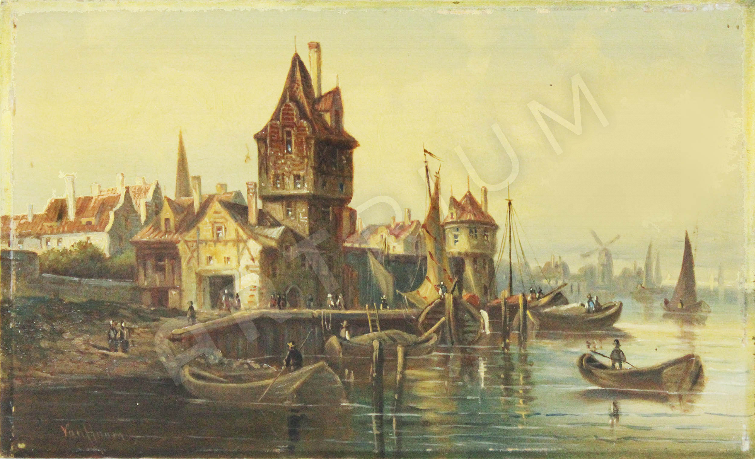 - Verso: signiert (in Rot): "Van Hoom"; Etikett mit unvollständiger Bezeichnung: "Holländische Hafenp(artie)