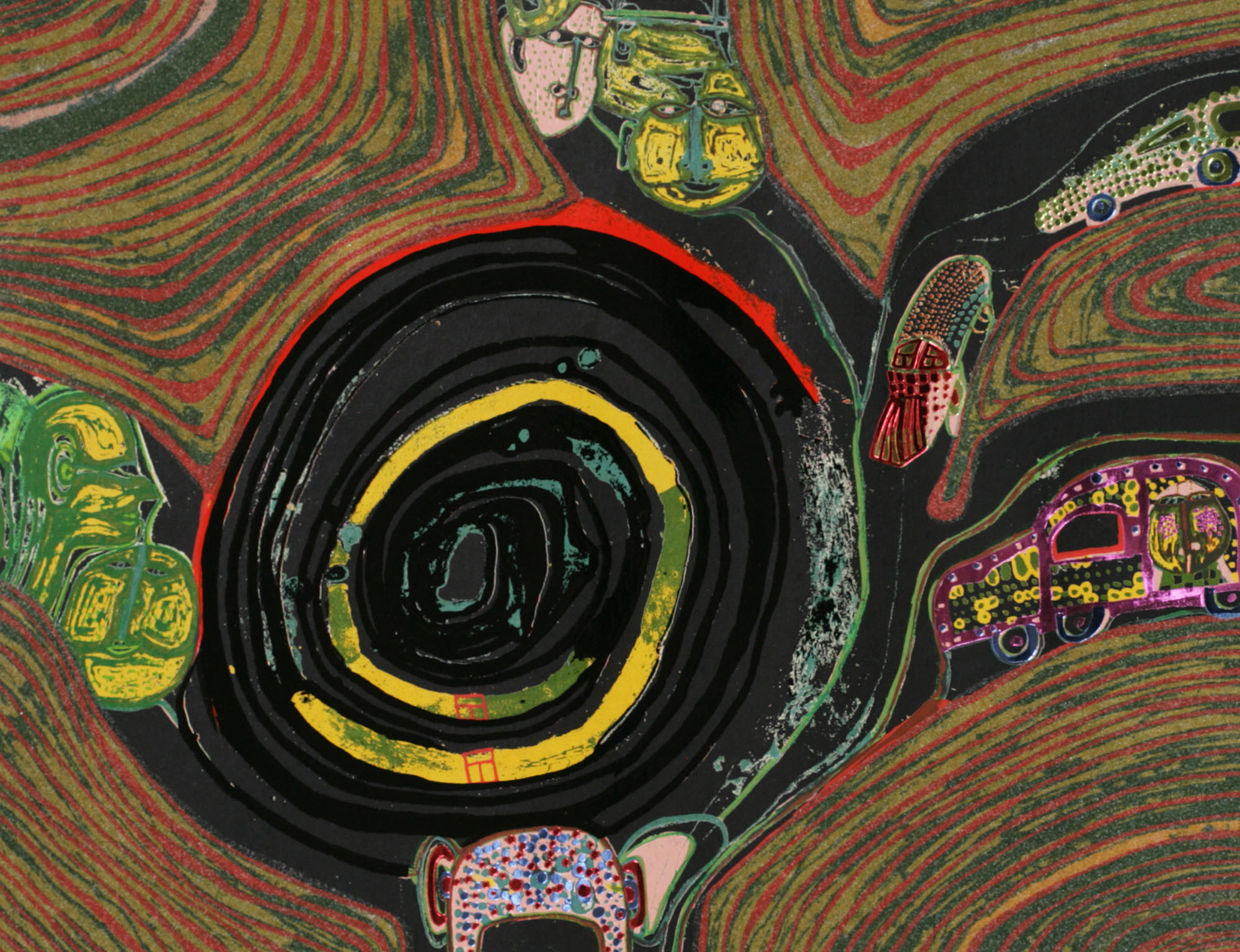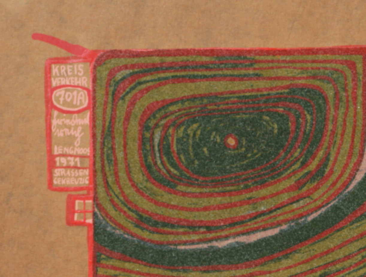 - Serigrafie in 17 Farben mit Metallprägungen in 7 Farben und 1 reflektierenden Glasstaubauflage auf braunem Teerpackpapier, Blatt 50 x 67 cm, Bild 39 x 58,8 cm, gedruckt bei Dietz Offizin, Lengmoos/Bayern, in Zusammenarbeit mit Günter Dietz 1971, links oben im Sieb "Kreisverkehr 701A Friedensreich Lengmoos 1971Strassengekreuzig(ten)", 15 Farbauszugpunkte in Ziffern und Prägestempel der Darstellung, 3 Prägestempel von Drucker und Verleger, Prägestempel "Hundertwasser Regentag", 3 japanische Prägestempel, Verlegt bei Ars Viva, Zürich