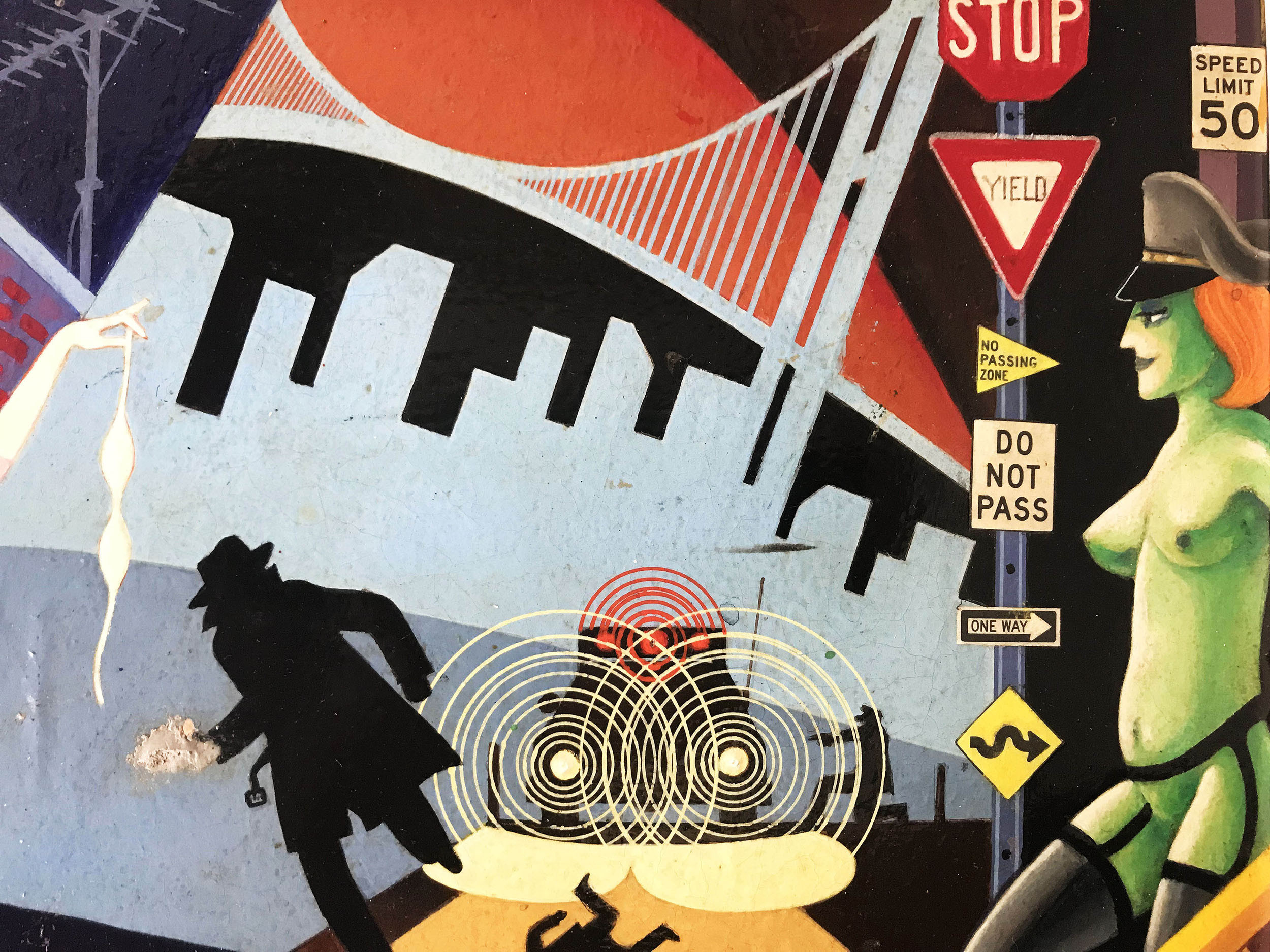 • Amerikanischer Maler und Illustrator, tätig in New York zwischen 1940 und 1960. Nolden zeigt in diesem Sittenbild im Stil des Art Deco eine erfundene Strassenszene in der Upper Westside des New York der 40er - Jahre mit Nachtleben, Kriminalität, Prostitution und Spielsucht.