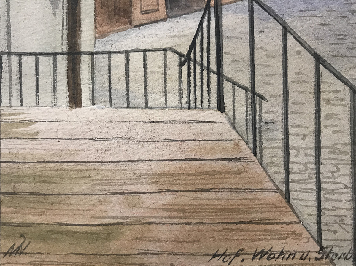 - monogrammiert: "MN", betitelt: "Hof Wohn u. Sterbehaus Joh. Strauß, II Floßgasse"