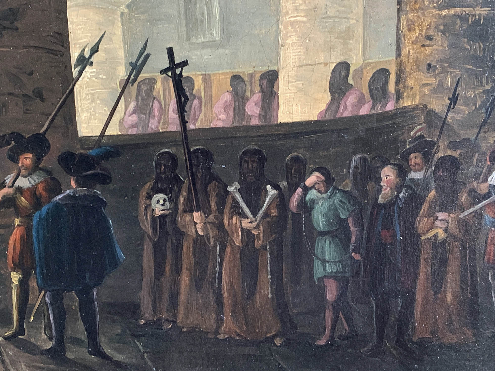 - Anton Schiffer zeigt in diesem Frühwerk die historische Szene eines Inquisitionsverfahrens unter der Leitung der römisch katholischen Kirche, bei dem der Delinquent dem Inquisitor vorgeführt wird.