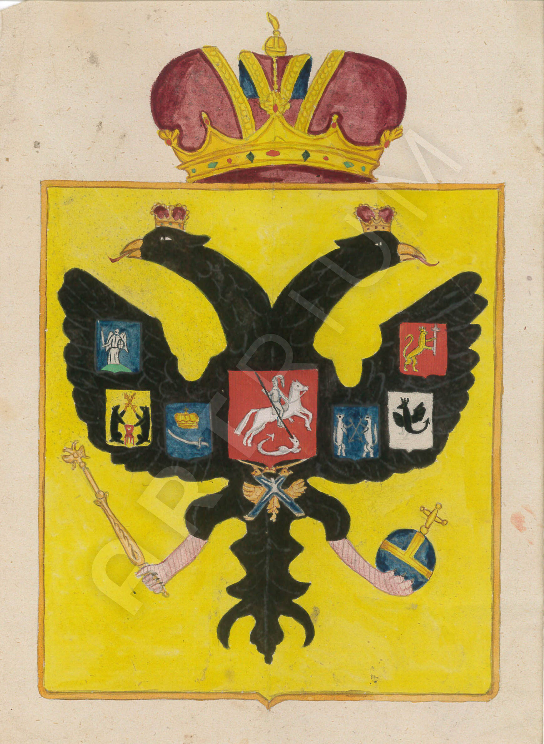 - Im Doppeladler sind verschiedene heraldische Embleme oder Allianzwappen