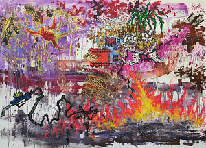 Acrylic, crayons, graffiti, oil and spray on canvas