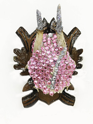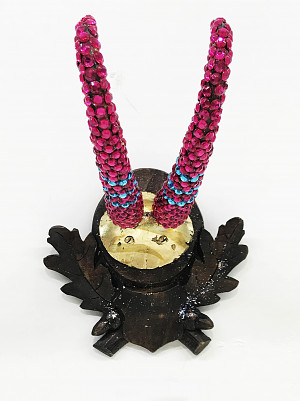Susanne Riegelnik Trophy 38 mixed media, diamond dust, glass crystals on hunting trophy 25.5 cm € 300.-