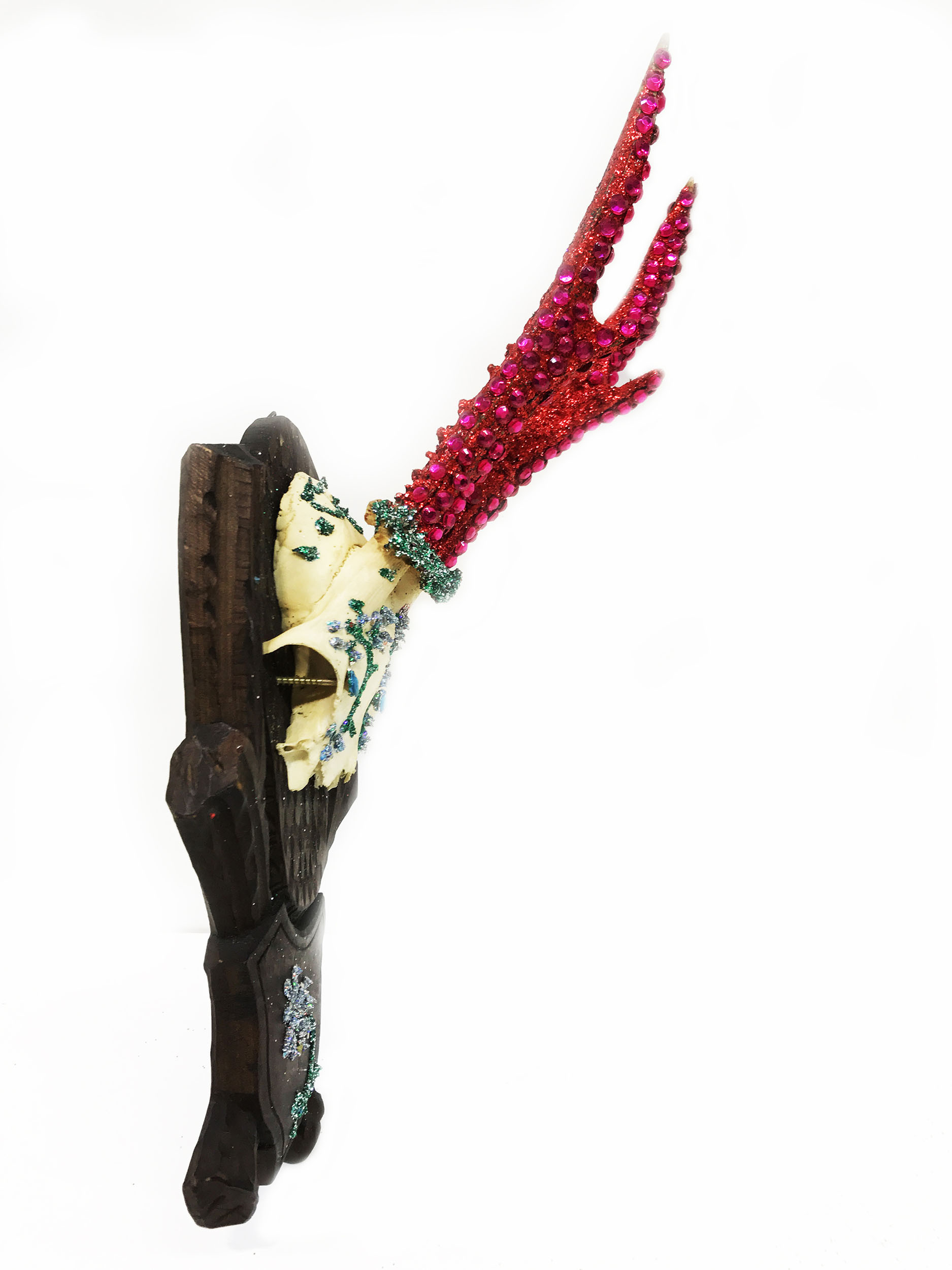 Mischtechnik, Diamantstaub, Glaskristalle auf Jagdtrophäe
