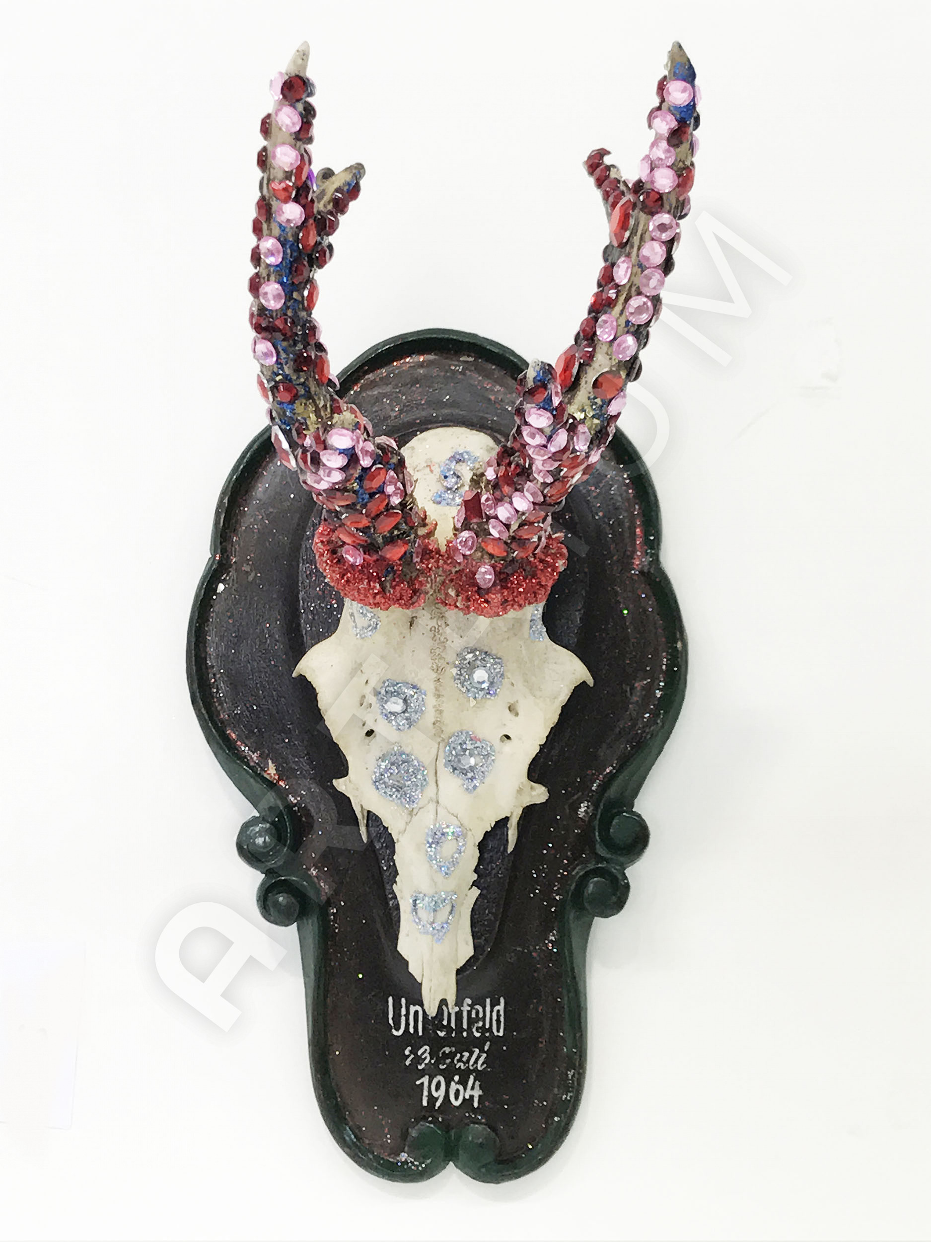 Mixed media, diamond dust, glass crystals on hunting trophy