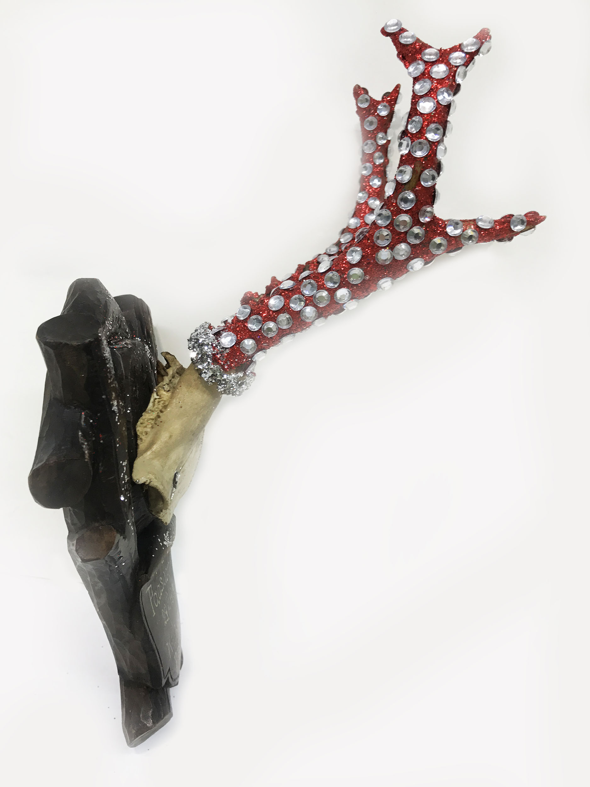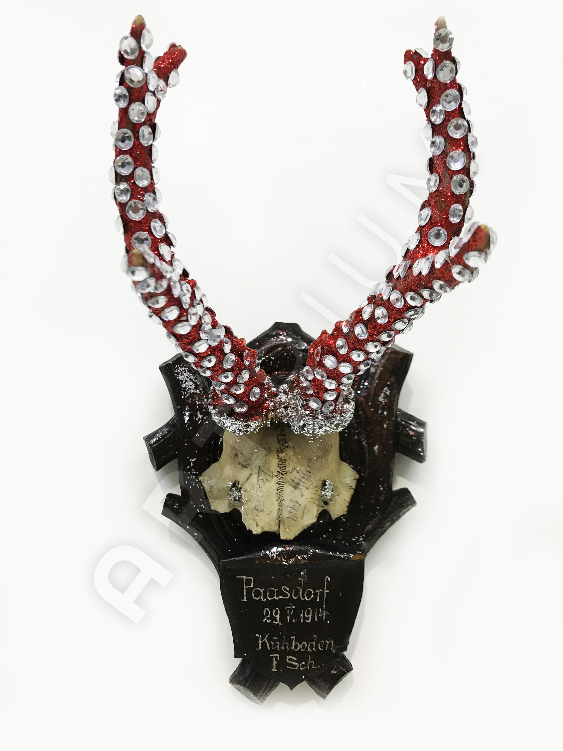 Mischtechnik, Diamantstaub, Glaskristalle auf Jagdtrophäe
