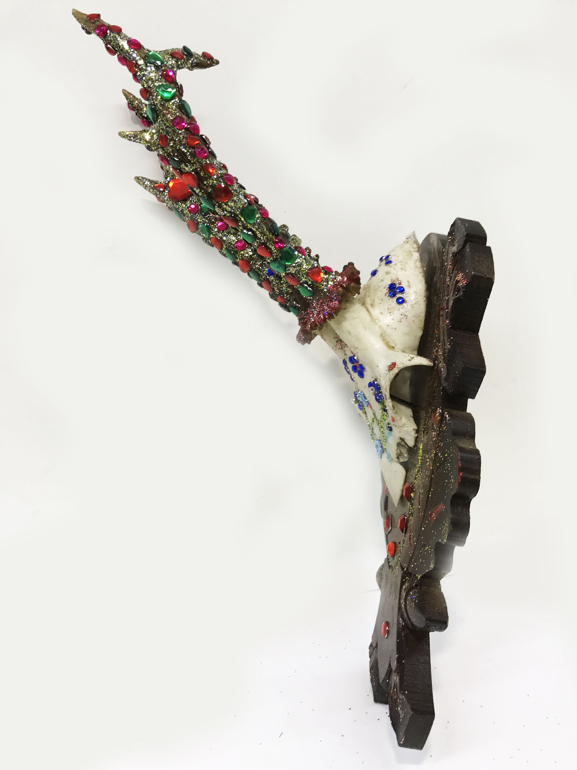 Mischtechnik, Diamantstaub, Glaskristalle auf Jagdtrophäe
