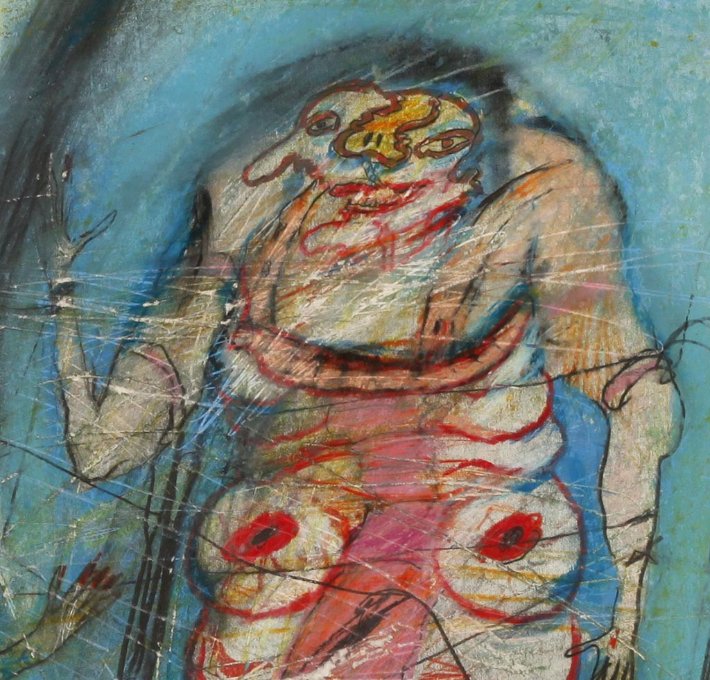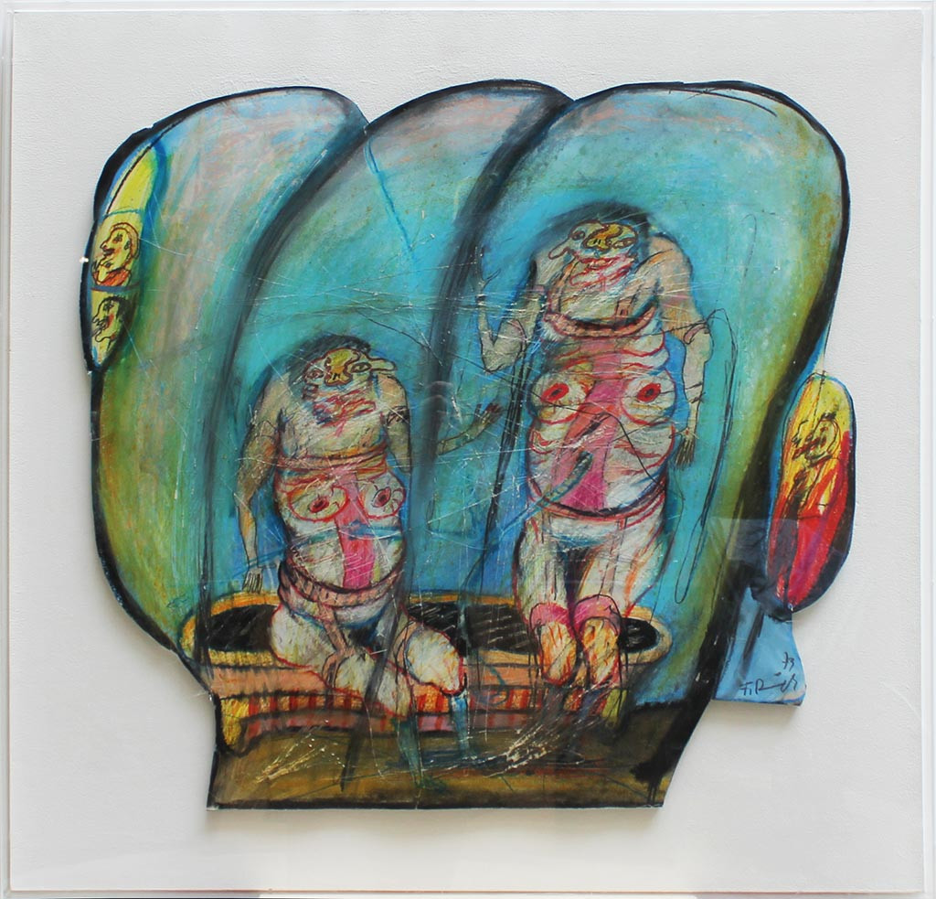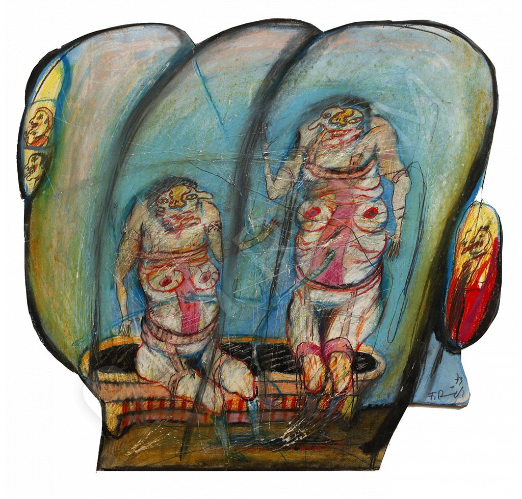 - Er war Gründungsmitglied der Gruppe Wirklichkeiten und malte gewöhnlich menschliche Figuren, die Motive aus den Tiefen des menschlichen Unbewussten oder der klassischen griechischen Literatur darstellen. In den 70er Jahren setzt sich Ringel mit den Malereien der Geisteskranken und psychopathologischer Kunst auseinander. Seine starkfarbigen Gemälde, die meist einander durch Nabelschnüre verbundene "Zwitterwesen" darstellen, stehen der art brut und Dubuffet nahe. Diese Arbeit stammt aus der Serie hermaphroditischen Geschlechtermonster. Peter Gorsen nennt sie figurative Psycho-Malerei.