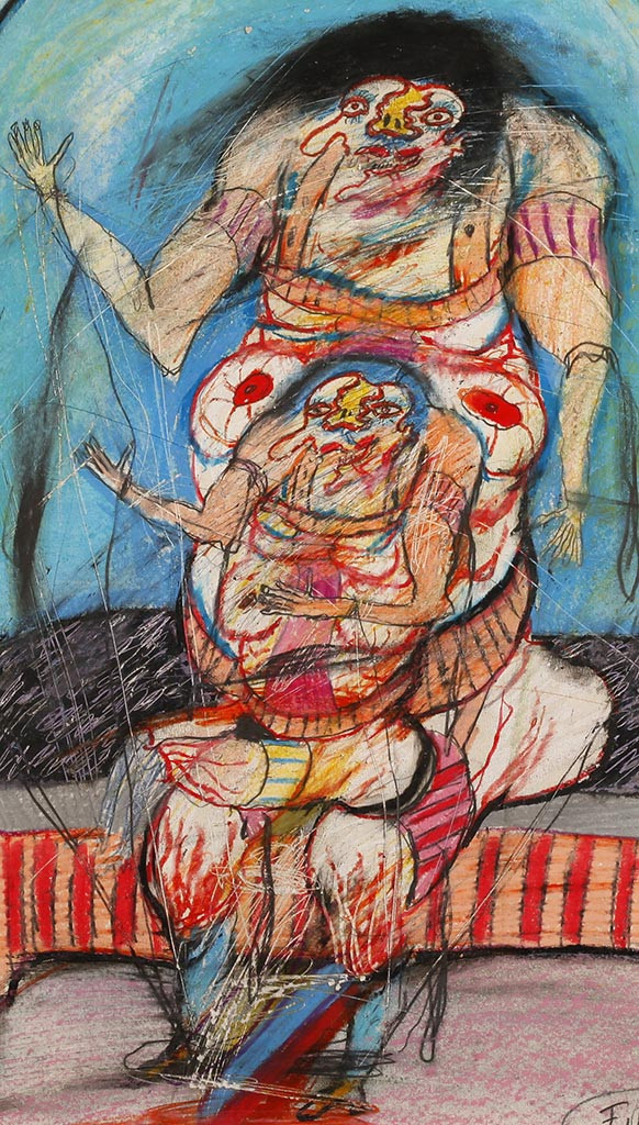 - Er war Gründungsmitglied der Gruppe Wirklichkeiten und malte gewöhnlich menschliche Figuren, die Motive aus den Tiefen des menschlichen Unbewussten oder der klassischen griechischen Literatur darstellen. In den 70er Jahren setzt sich Ringel mit den Malereien der Geisteskranken und psychopathologischer Kunst auseinander. Seine starkfarbigen Gemälde, die meist einander durch Nabelschnüre verbundene "Zwitterwesen" darstellen, stehen der L'art brut und Dubuffet nahe. Diese Arbeit stammt aus der Serie hermaphroditischen Geschlechtermonster. Peter Gorsen nennt sie figurative Psycho-Malerei.