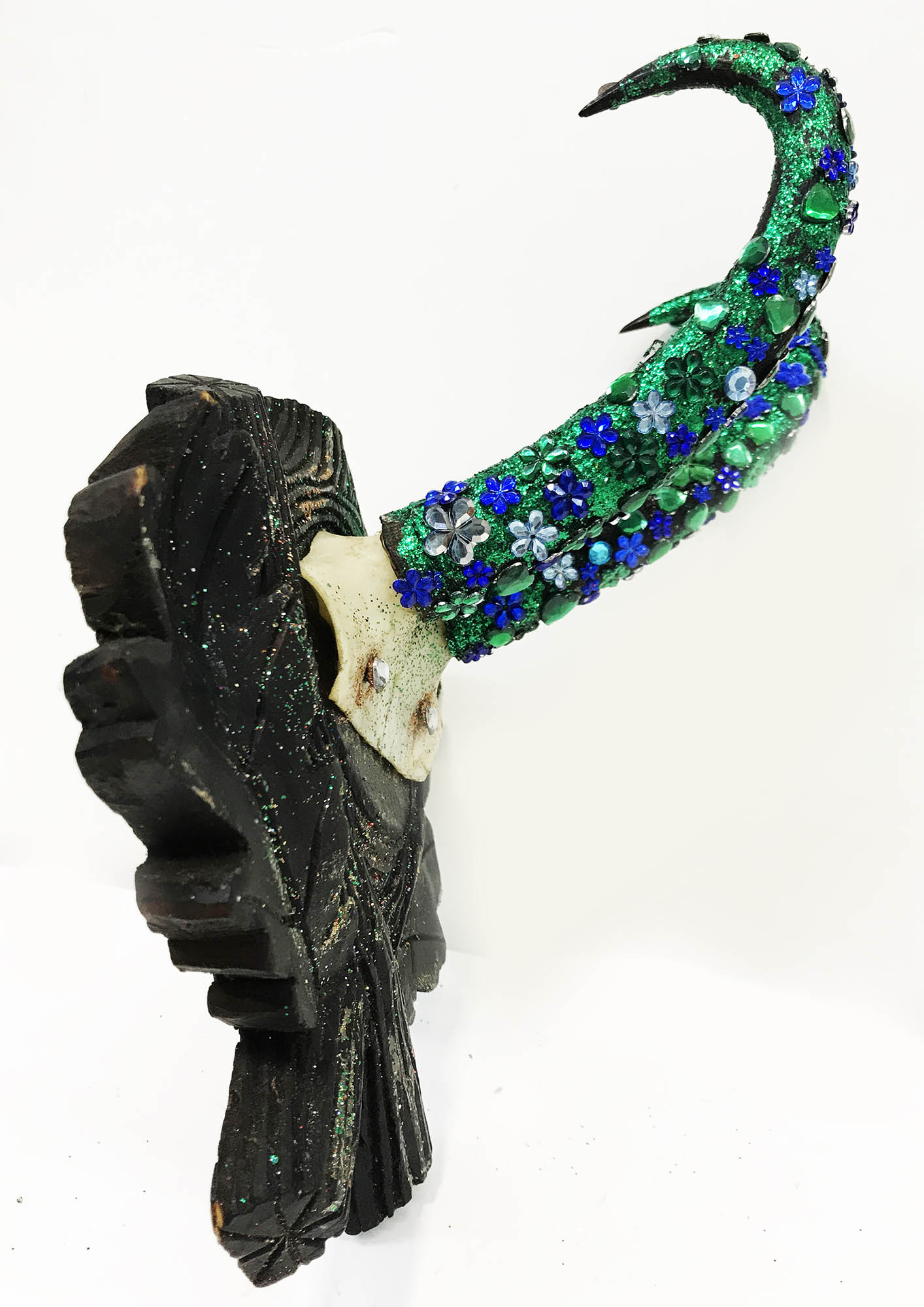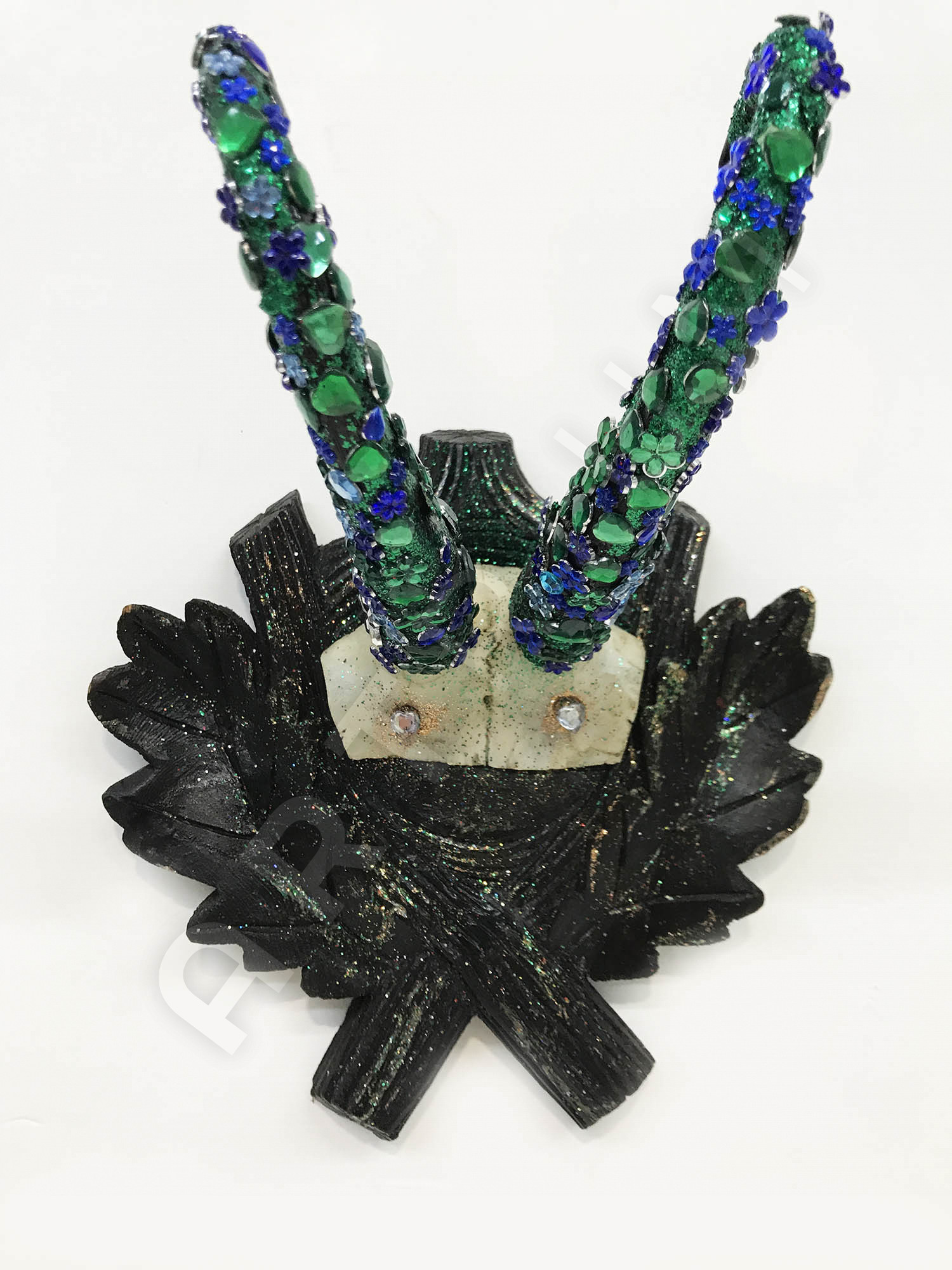mixed media, diamond dust, glass crystals on hunting trophy