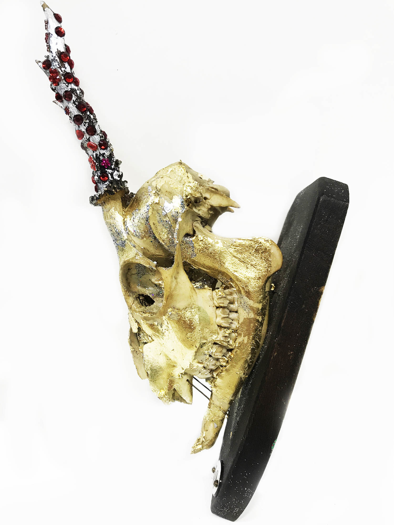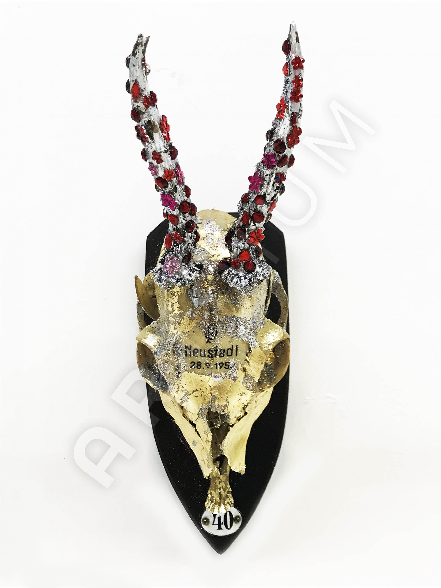Mischtechnik, Diamantstaub, Glaskristalle auf Jagdtrophäe