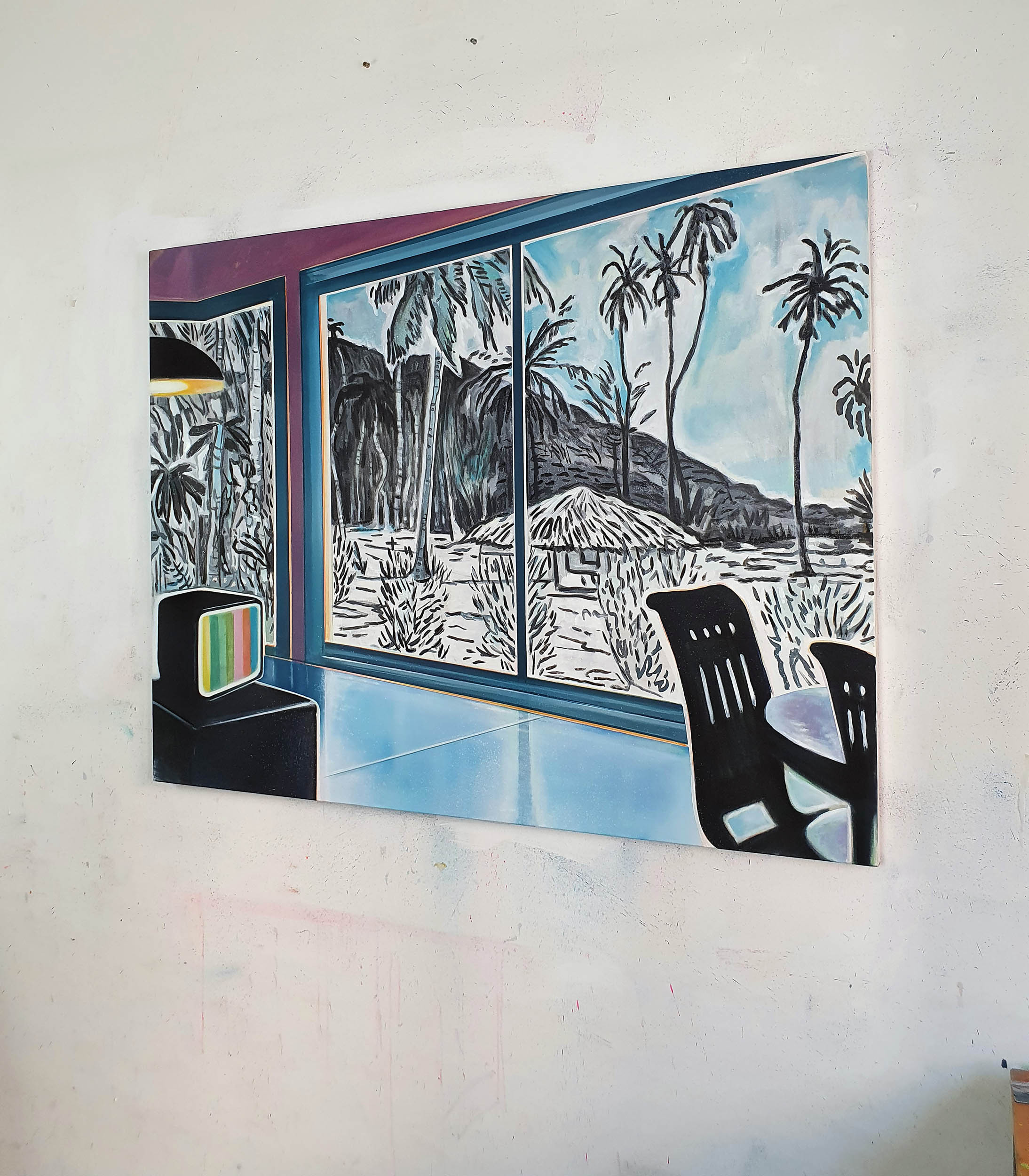 In einem von Stress geplagten Alltag und einer immer dynamischer werdenden Gesellschaft, in deren Zentrum der Fortschritt und die Technik steht, sehnt man sich zunehmend nach einem Gegenbild, nach Orten, an denen die Zeit still zu stehen scheint. Seine Ölbilder stellen ein Ideal und eine Idylle dar, in der sich der Wunsch nach Einfachheit und Problemlosigkeit wiederspiegelt. Die Arbeiten entsprechen einem Konstrukt, das in natürlicher Form gar nicht existiert. Es geht nicht nur darum Orte wieder aufleben zu lassen und in einer neuen Form darzustellen, sondern idealisierte Vorstellungen, die von unserem Umfeld hervorgerufen werden, zu hinterfragen. In seinen Arbeiten zelebriert er und hinterfrage die Geschichte des Mediums. Die Arbeiten zeigen ein Bewusstsein für die fortdauernde Bedeutung der Malerei als Kommunikationsmittel für die Art und Weise, wie wir unser tägliches Leben erleben. In den Arbeiten zeigt Cotroneo eine starke Mischung aus Atmosphäre und Zwischenfall, Alleinsein und Sinnhaftigkeit. Die Malereien stellen Situationen als psychologische Ereignisse dar und beschreiben Reisen, Transit und Orte wie aus einer existenziellen Perspektive. Ihre Vision ist stark, fragend, distanziert, ihr Empfinden von Ort und Zeit sind mit jenen des modernen Reisenden vergleichbar, der zugleich isoliert, staatenlos, leidenschaftslos und doch verletzlich ist. Zufälligkeit und Stase bestimmen die Stimmung. Farbe, Form und Zusammensetzung sind angespannt, zielstrebig und beschreiben Situationen des „geöffneten Bewusstseins“. Dichtung und Flüchtigkeit präsidieren, die Dimensionen erhöhter Momente werden im Medium der Malerei transkribiert. Durch die entstehende „Flächigkeit“, die zunächst klar, plakativ und oft farbenfroh wirkt, wird versucht mehr psychologischen Raum entstehen zu lassen, die der Betrachter für eigene Assoziationen nützen soll.