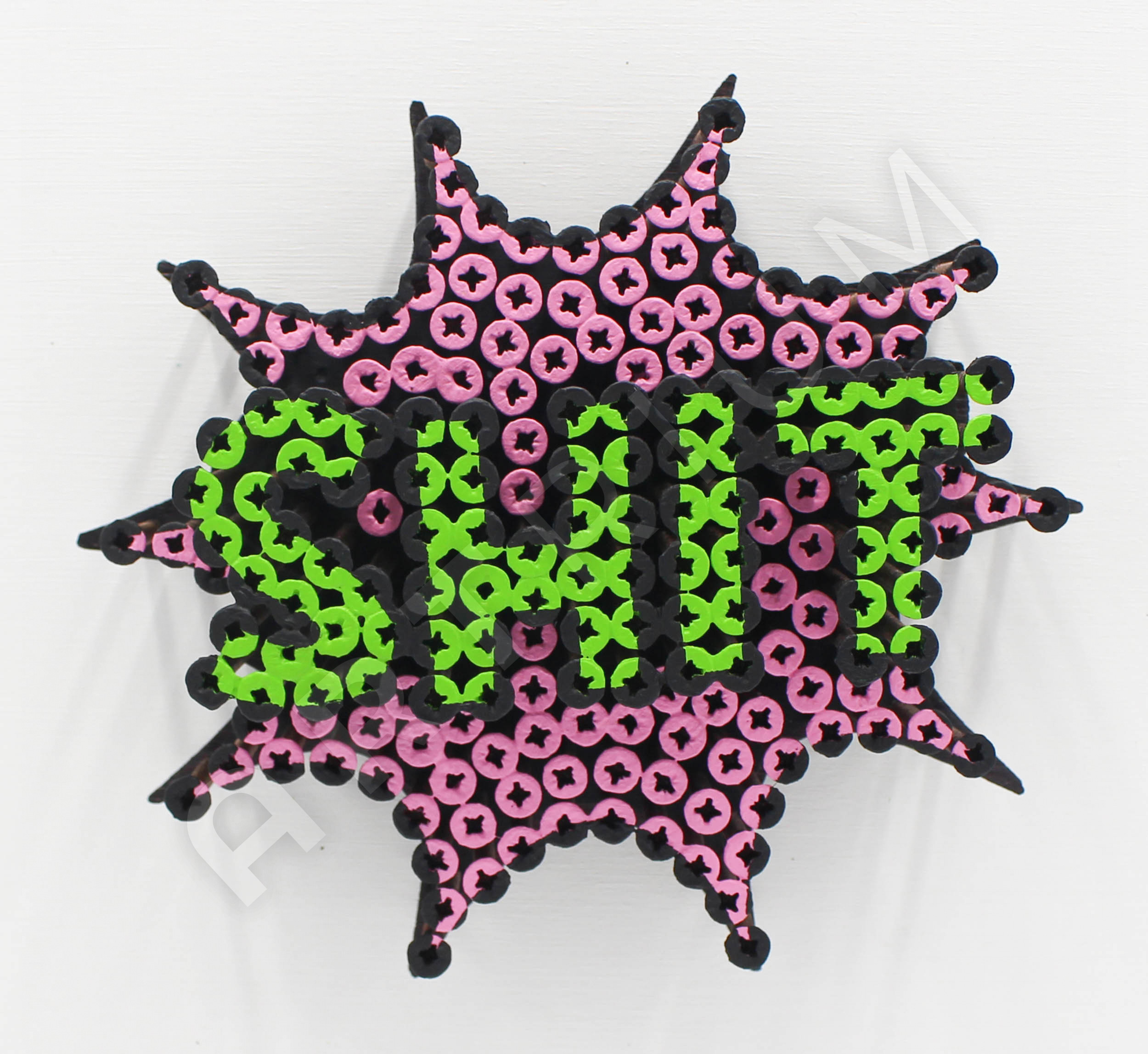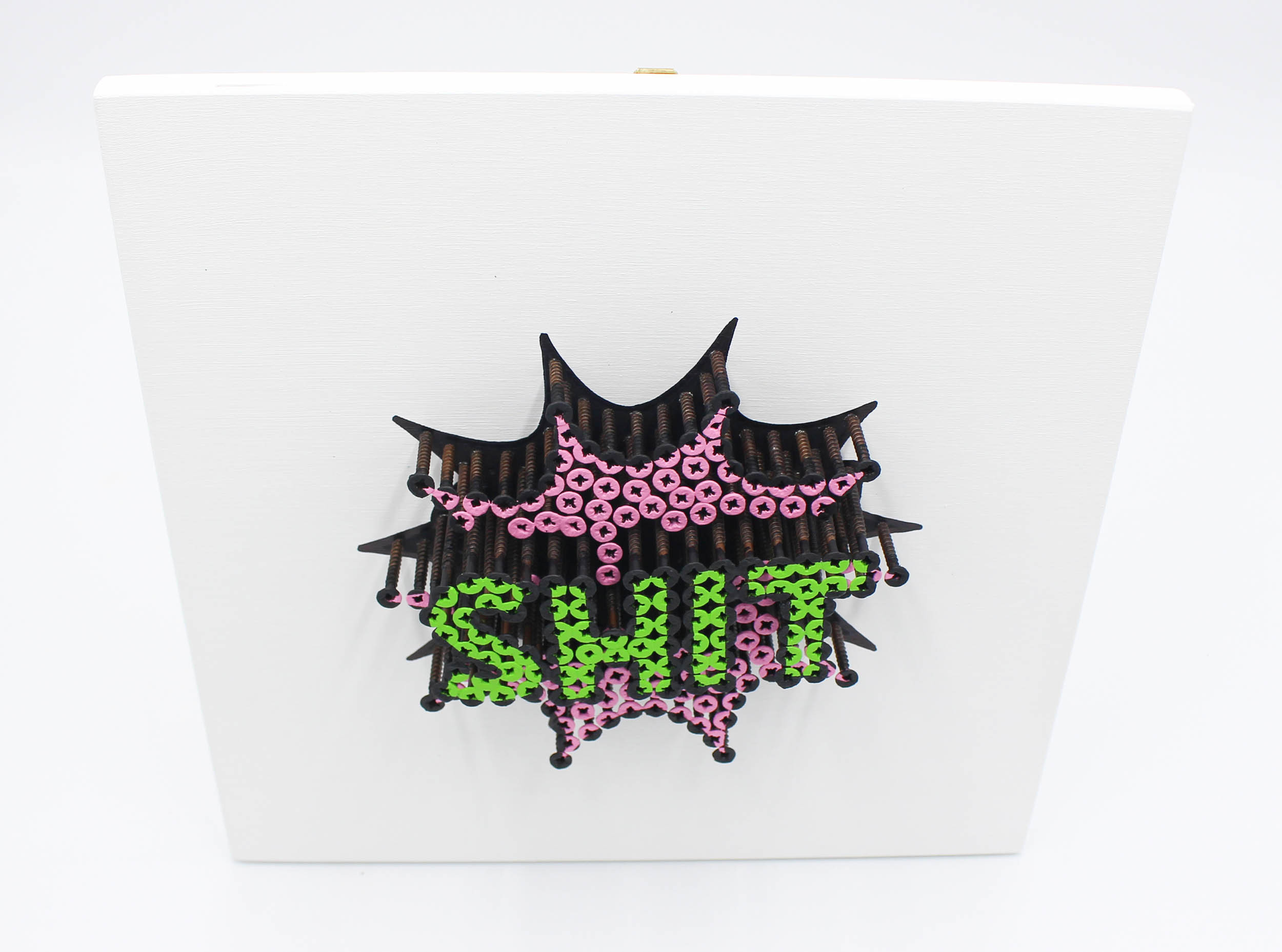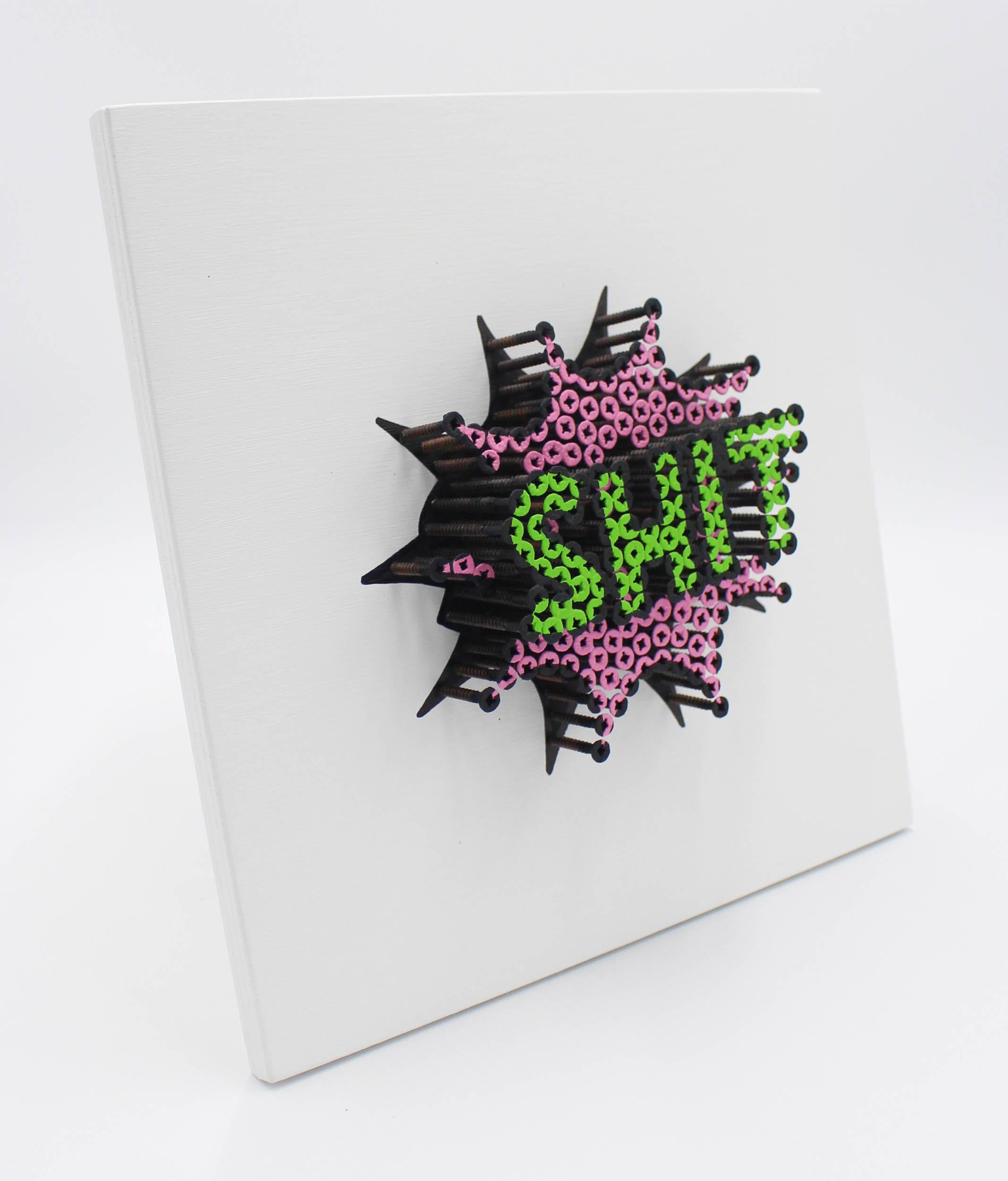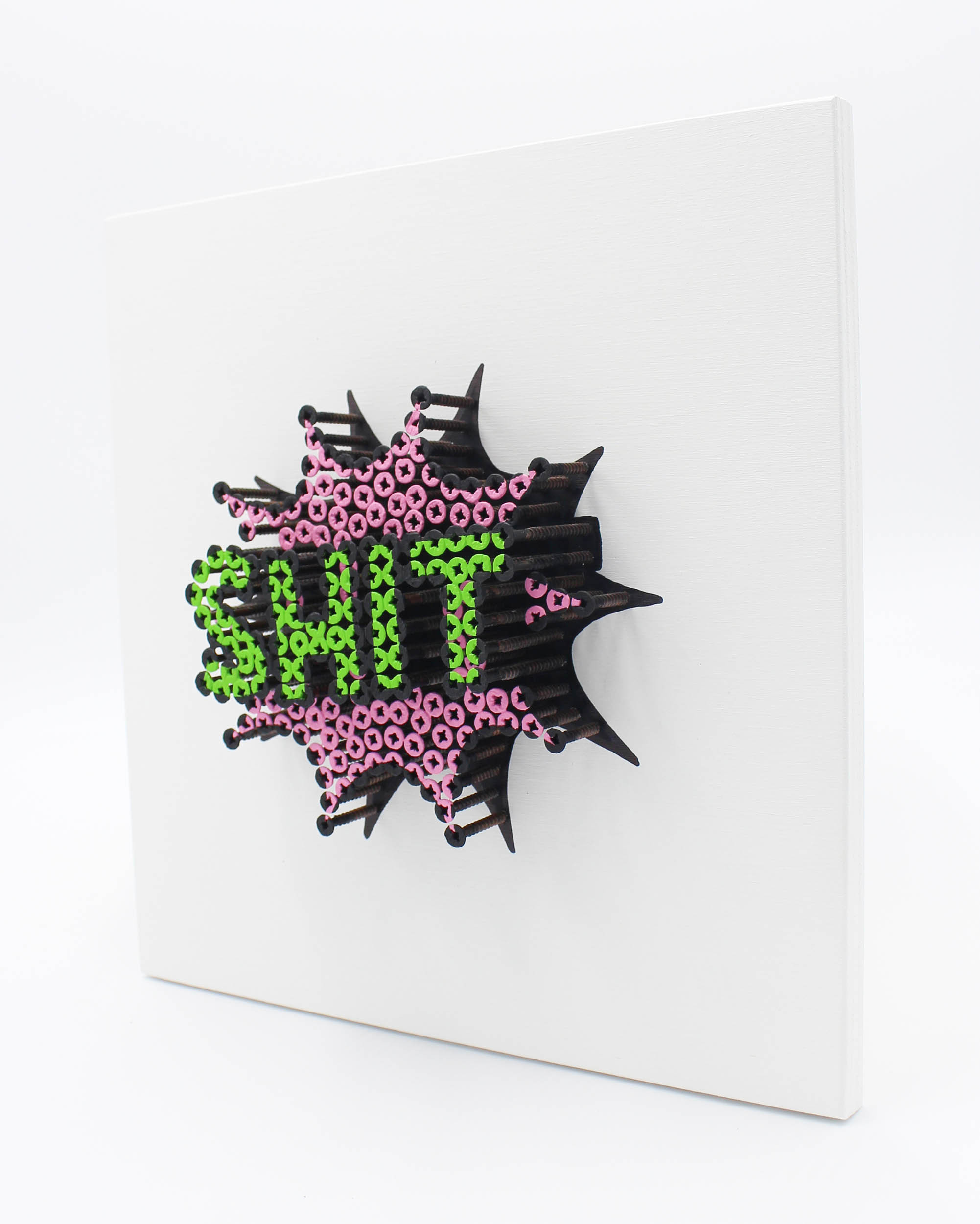 Alessandro Padovan (geb. 1983), Autodidakt und diplomierter Mechanik-Experte, begann seine künstlerische Tätigkeit mit der Gründung eines Künstlerduos namens Drill Monkeys Art Duo im Jahr 2012 und setzte sie dann ab Januar 2017 unabhängig fort. Es ist ein Abenteuer, bei dem er mit einer alternativen Technik arbeitet: selbstschneidende Schrauben und Acrylfarbe auf Tafel. Ein Weg, der dem Bedürfnis entspricht, den Werken Dreidimensionalität zu verleihen und ironischerweise die Grenzen zwischen Skulptur und Malerei zu überschreiten. Die Schrauben sind in der Tat in verschiedenen Tiefen angebracht und bilden verschiedene Ebenen, durch die die Figuren Gestalt annehmen. Die Technik der Schraubenkunst ist nicht sehr bekannt. In den letzten 7 Jahren ist es Alessandro gelungen, in Galerien, Auktionshäusern, Kunstmessen in Italien und im Ausland und bei wichtigen Wohltätigkeitsveranstaltungen präsent zu sein. Die Originalität dieses Werks liegt offensichtlich in der Technik und dem dreidimensionalen Effekt, der durch das Eindrehen ganz gewöhnlicher Schrauben in verschiedenen Tiefen erzielt wird, die sich durch das Bemalen in ein zeitgenössisches bildhauerisches und malerisches Werk verwandeln.