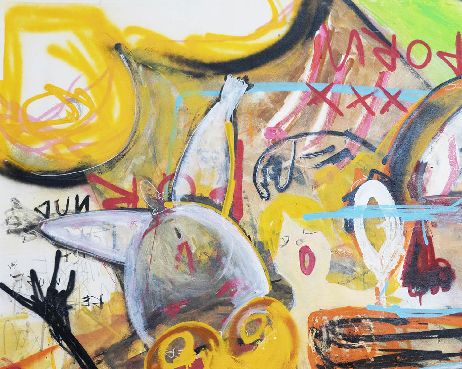 Acryl, Öl, Kreide, Graffiti, Spray auf Leinwand