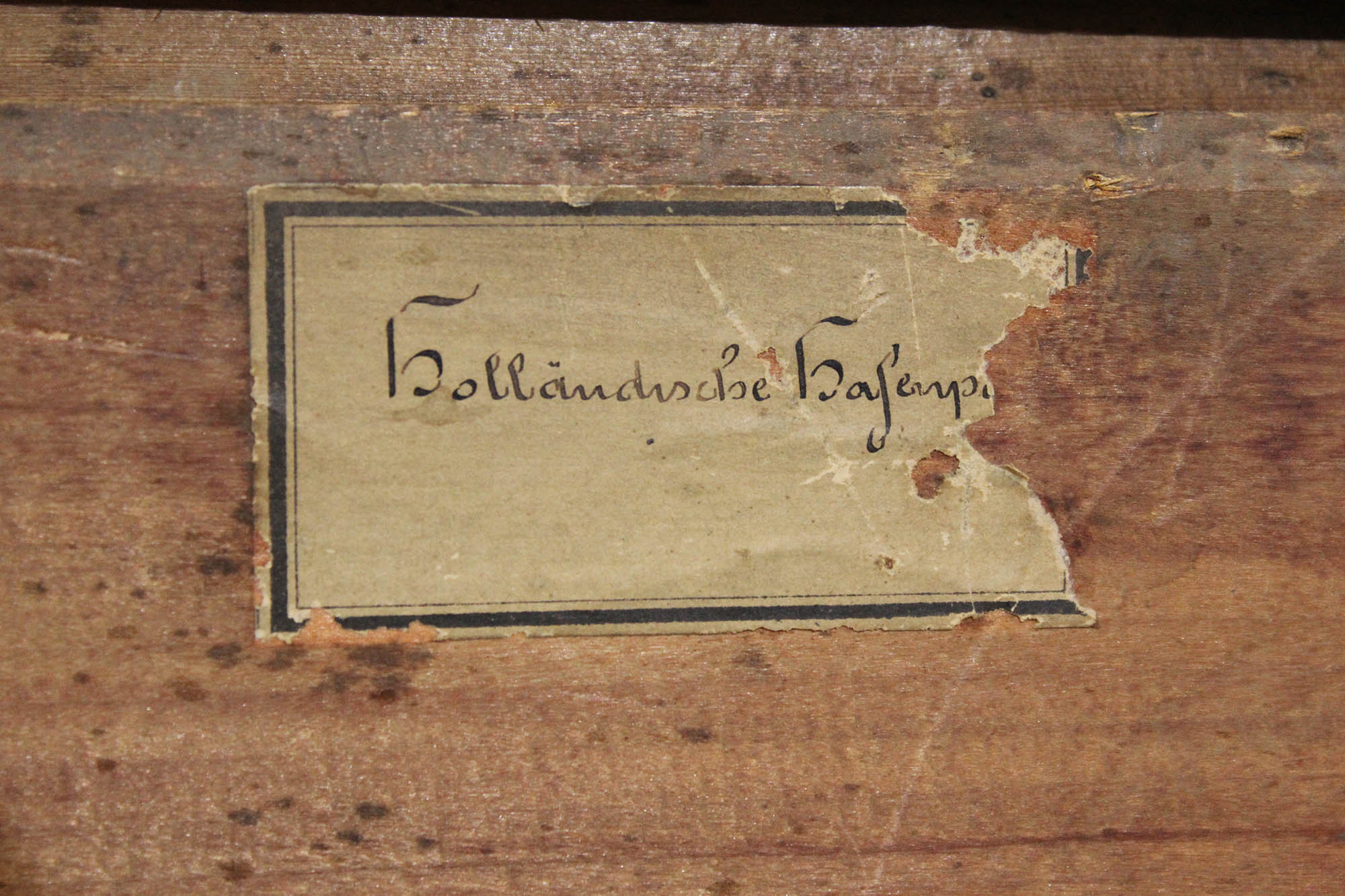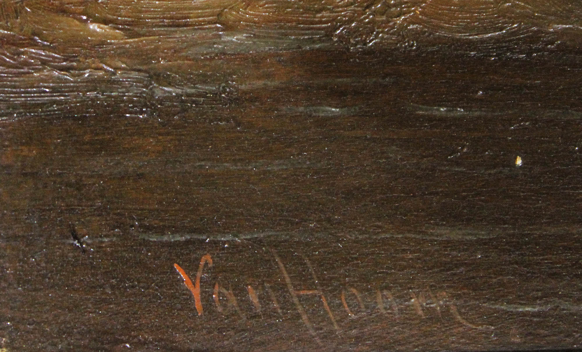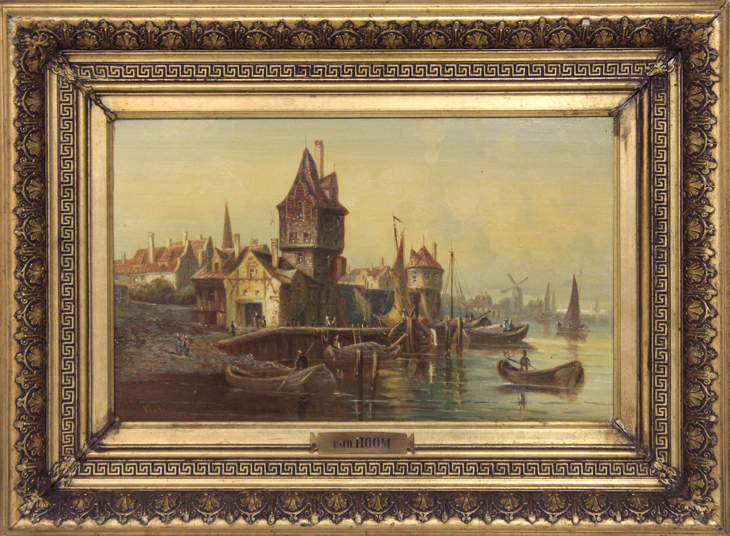 - Verso: signiert (in Rot): "Van Hoom"; Etikett mit unvollständiger Bezeichnung: "Holländische Hafenp(artie)