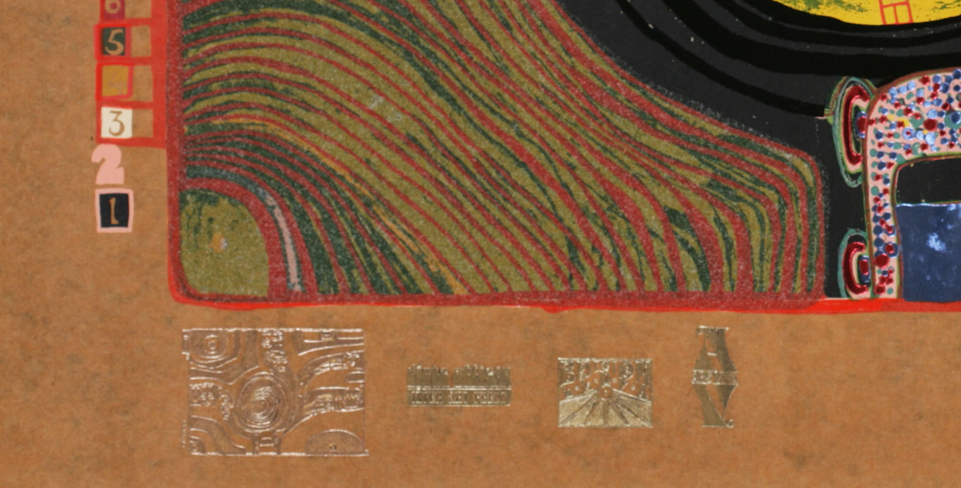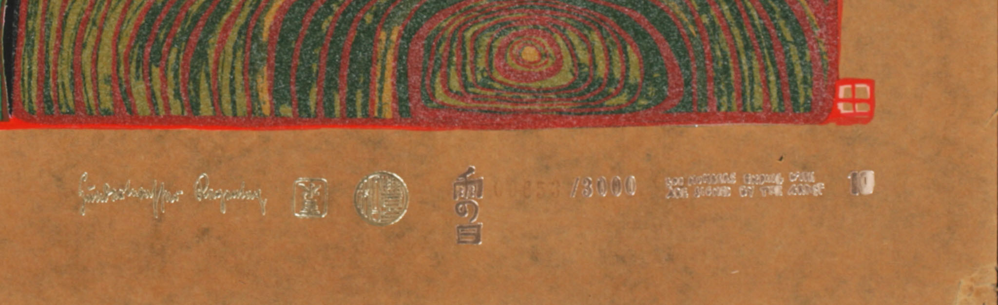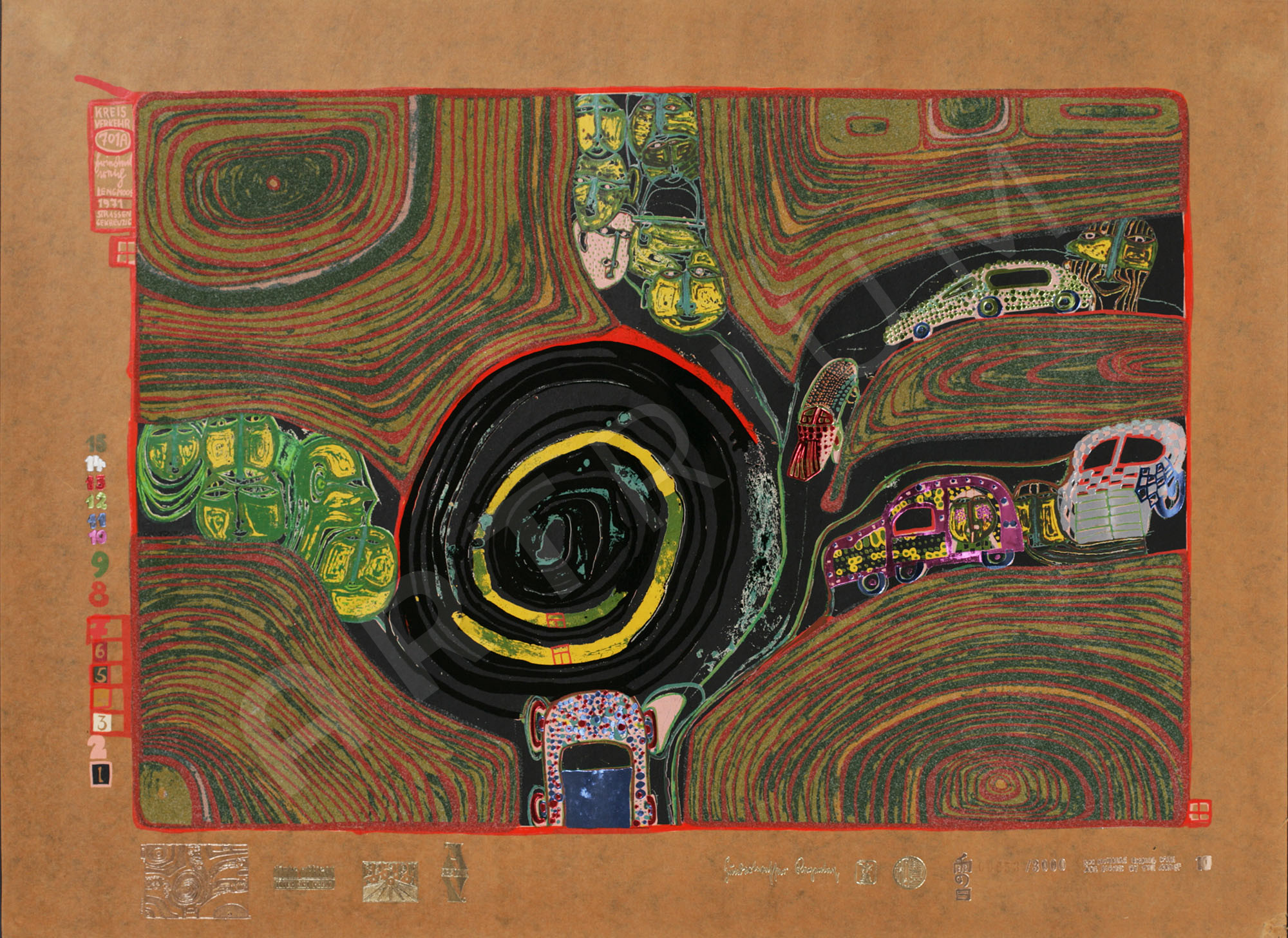 - Serigrafie in 17 Farben mit Metallprägungen in 7 Farben und 1 reflektierenden Glasstaubauflage auf braunem Teerpackpapier, Blatt 50 x 67 cm, Bild 39 x 58,8 cm, gedruckt bei Dietz Offizin, Lengmoos/Bayern, in Zusammenarbeit mit Günter Dietz 1971, links oben im Sieb "Kreisverkehr 701A Friedensreich Lengmoos 1971Strassengekreuzig(ten)", 15 Farbauszugpunkte in Ziffern und Prägestempel der Darstellung, 3 Prägestempel von Drucker und Verleger, Prägestempel "Hundertwasser Regentag", 3 japanische Prägestempel, Verlegt bei Ars Viva, Zürich