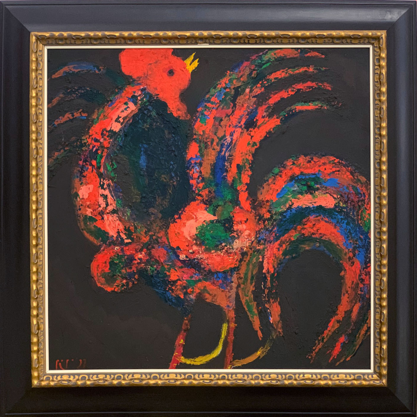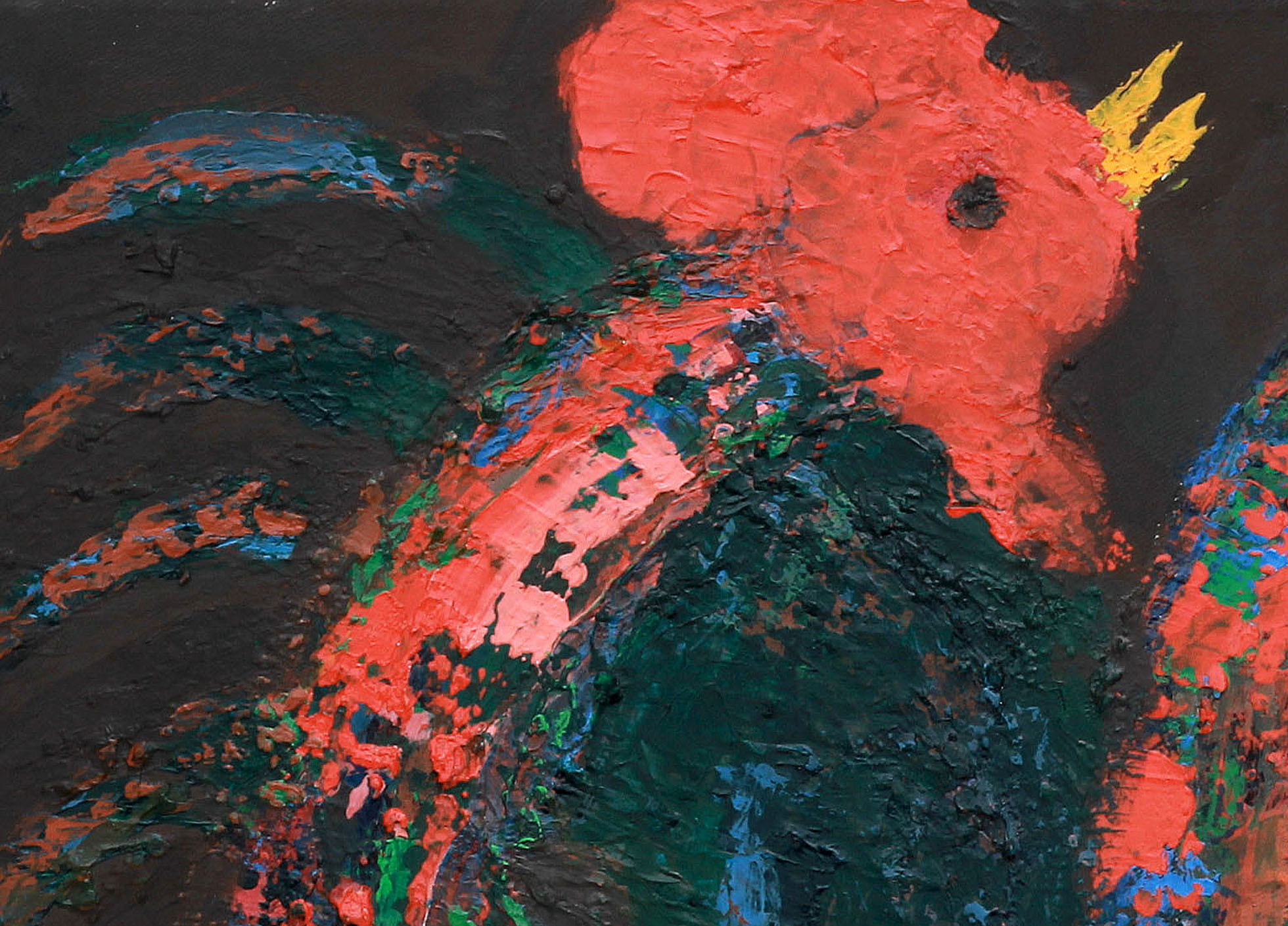 • ein krähender Hahn im Profil, welcher zu den bekanntesten Motiven des Künstlers zählt