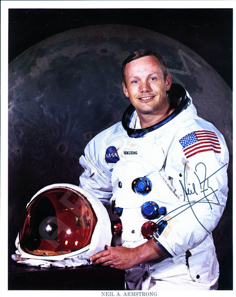 - Neil Alden Armstrong war ein US-amerikanischer Testpilot und Astronaut. Er war Kommandant von Apollo 11, die mit Buzz Aldrin und Michael Collins zum Mond flog. Am 21. Juli 1969 betrat er als erster Mensch den Mond. Diese Autogrammkarte erhielt die Inhaberin Käthe Musil des beliebten Weinlokals 10er-Marie in Wien anlässlich eines Besuchs von Neil Armstrong.