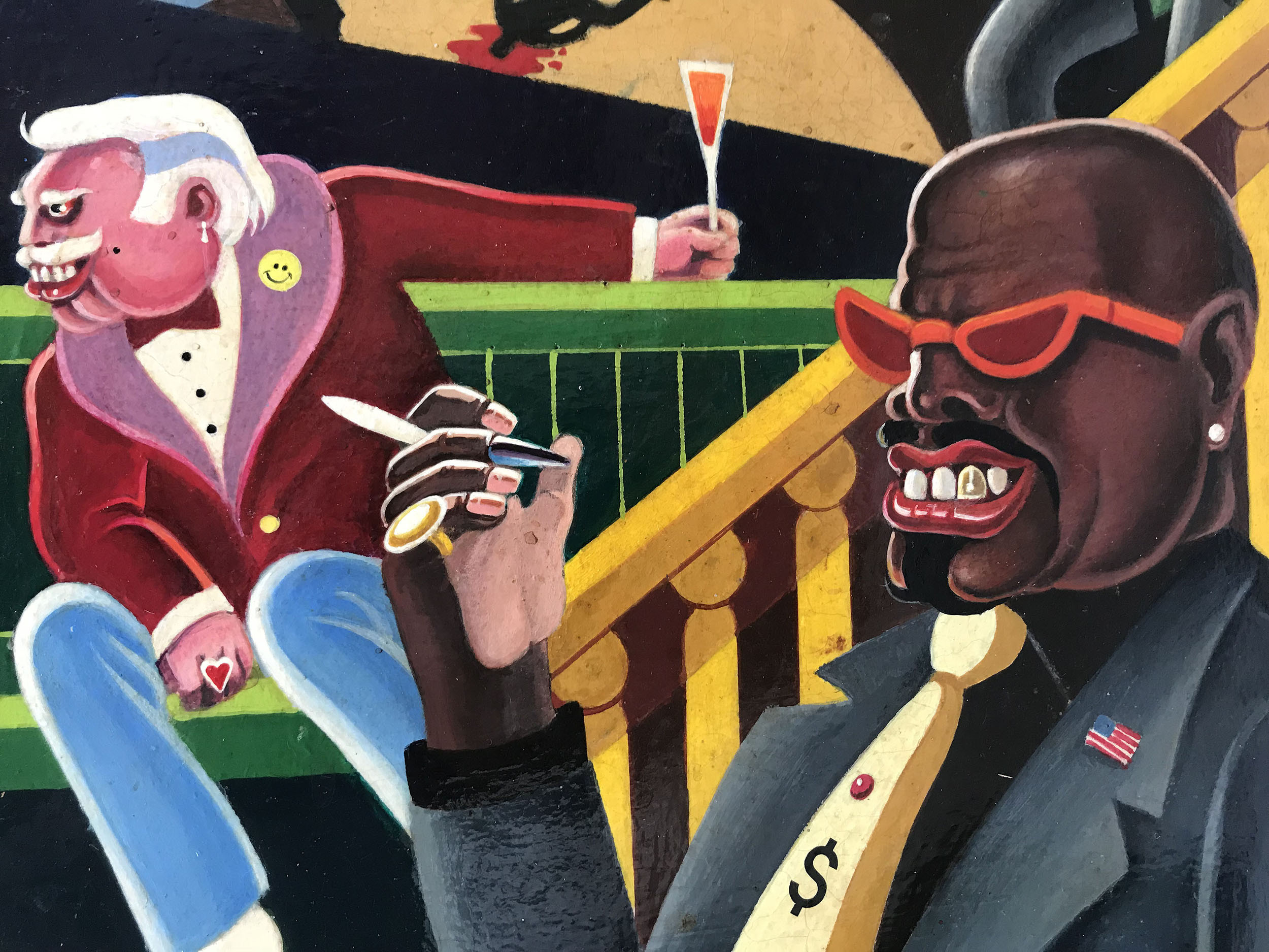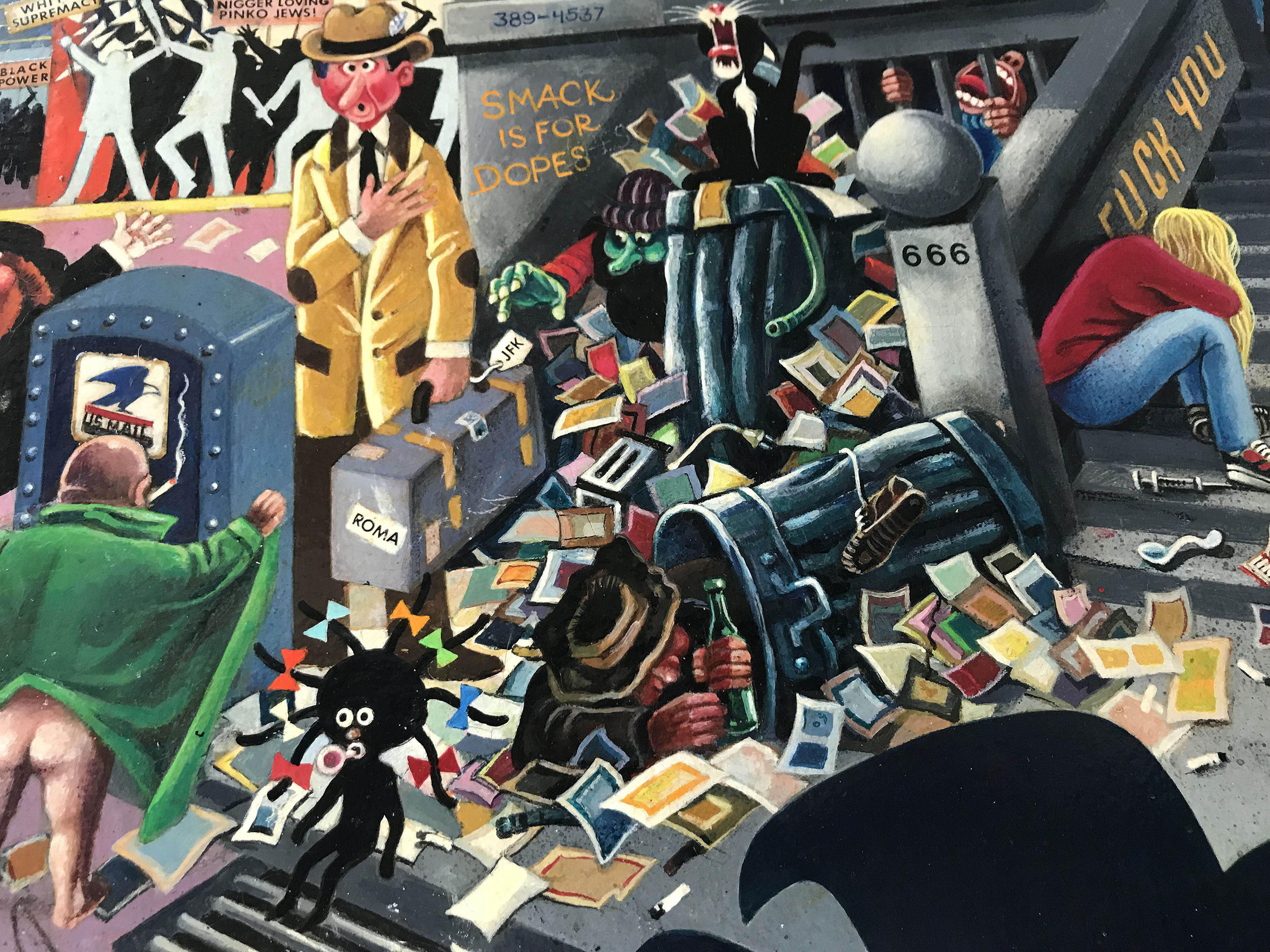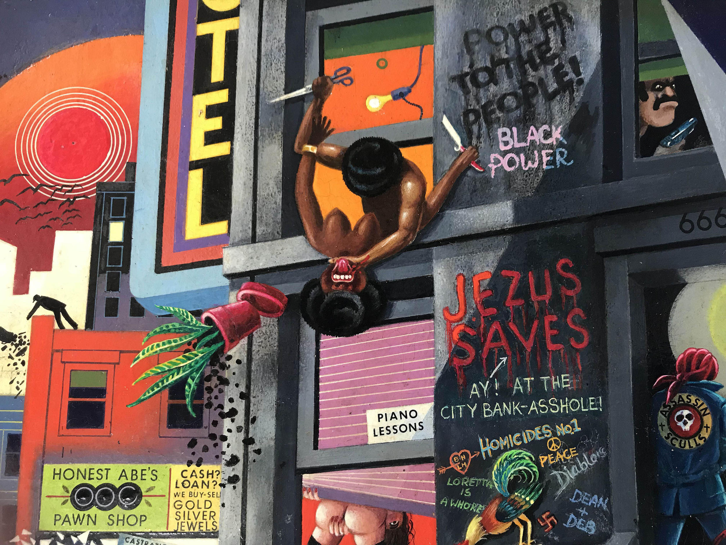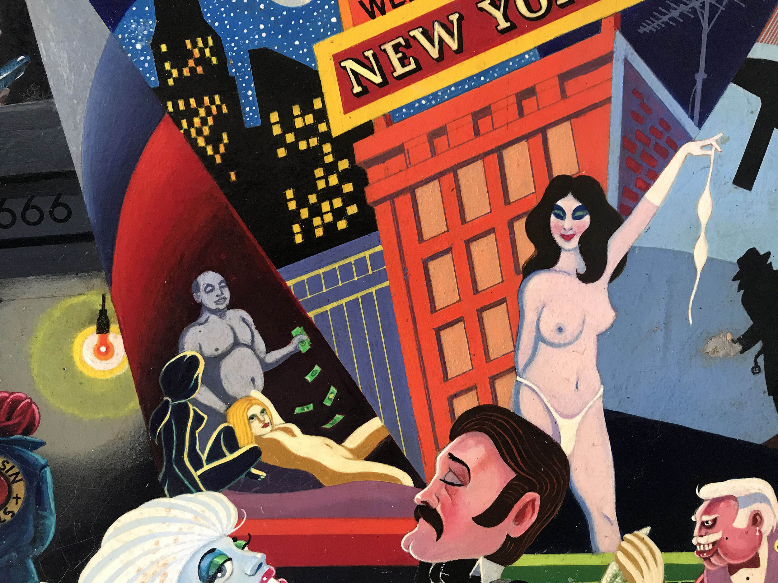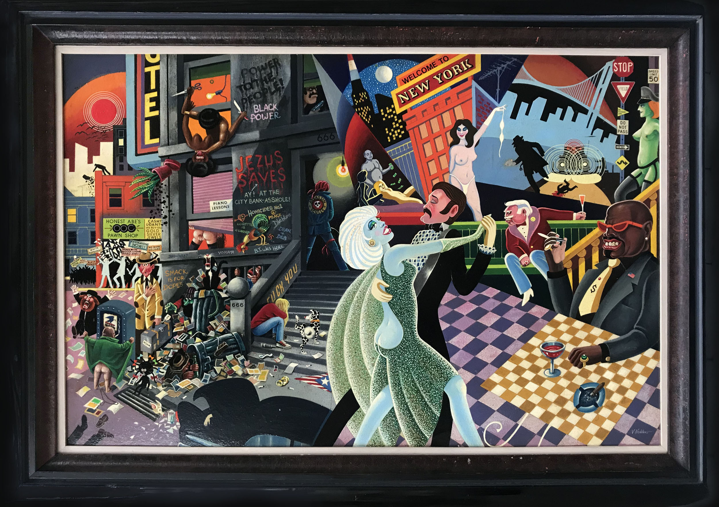 - Amerikanischer Maler und Illustrator, tätig in New York zwischen 1940 und 1960. Nolden zeigt in diesem Sittenbild im Stil des Art Deco eine erfundene Strassenszene in der Upper Westside des New York der 40er - Jahre mit Nachtleben, Kriminalität, Prostitution und Spielsucht.