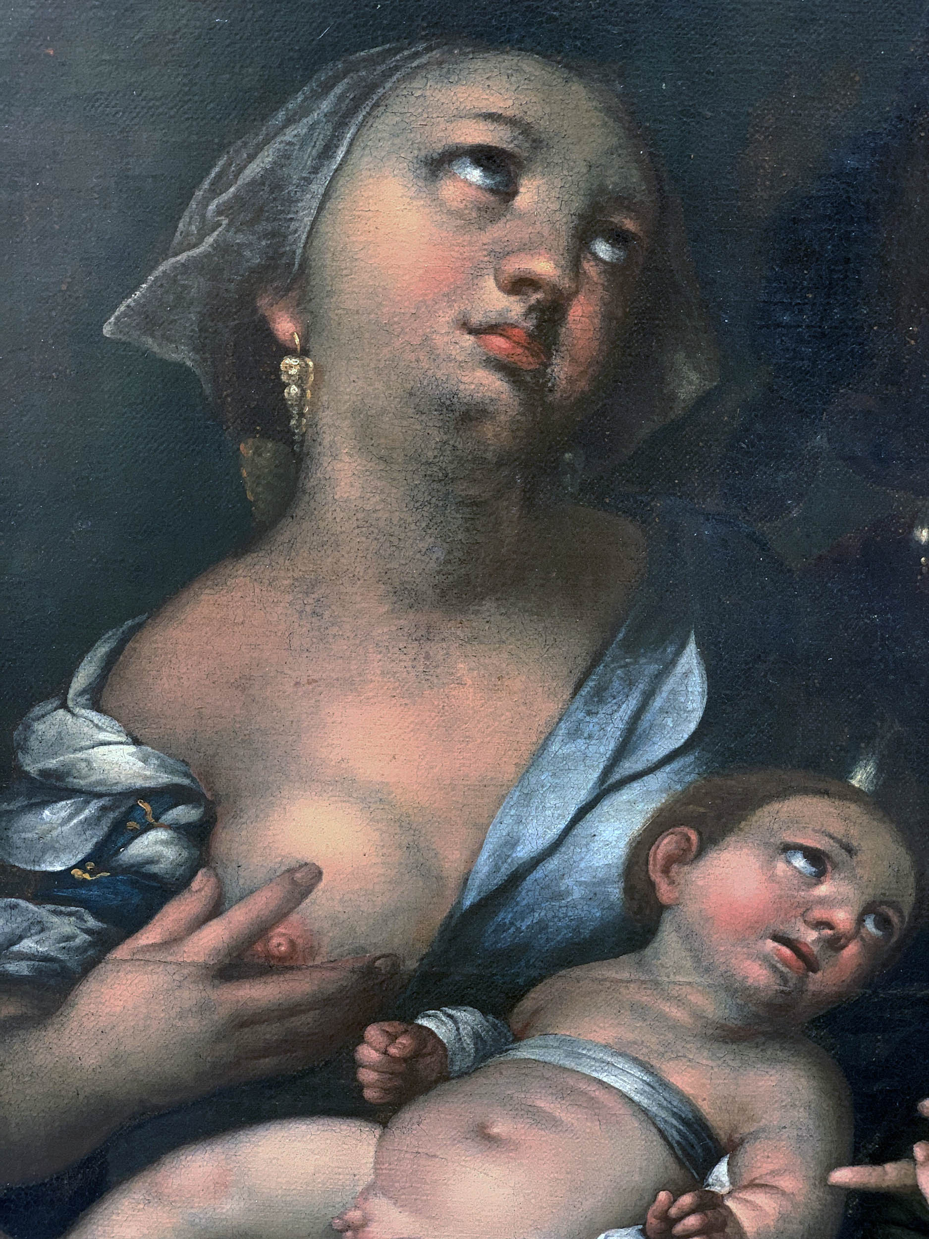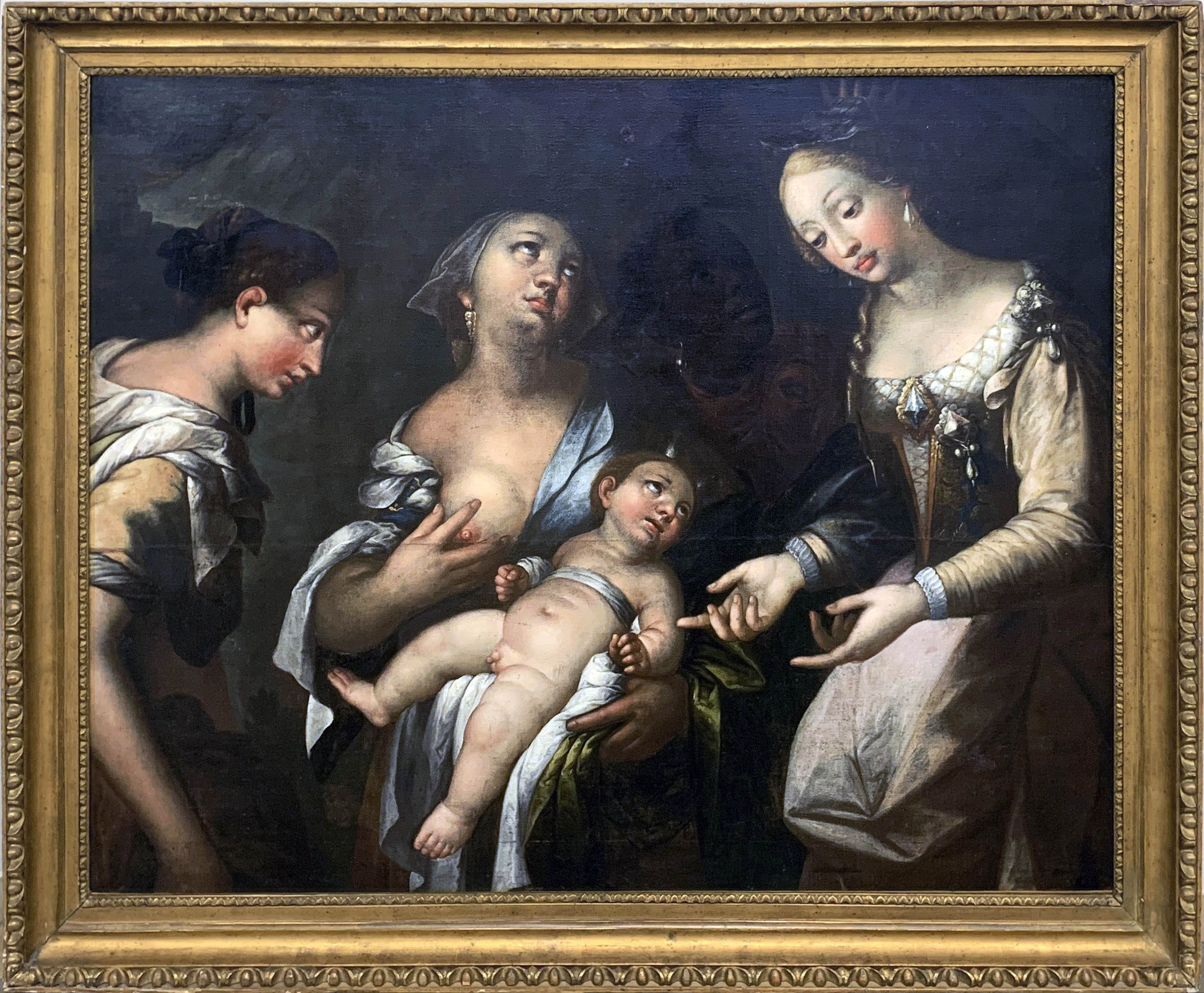 - Das Motiv dieses Gemäldes stammt aus der Bibel (Ex 2, 5–10) und zeigt, wie Pharaos Tochter den kleinen Moses aus dem Wasser rettet und ihn einer Amme übergibt, die in Wirklichkeit seine Mutter ist. In der christlichen Symbolik nimmt dieses Ereignis aus dem Alten Testament Christus vorweg, der dem Gemetzel der Unschuldigen in Bethlehem entkommen wird. Die zentrale Gruppe in unserem Bild, die Mutter und der kleine Moses, erinnert an die Gruppe der Jungfrau Maria und des Kindes.