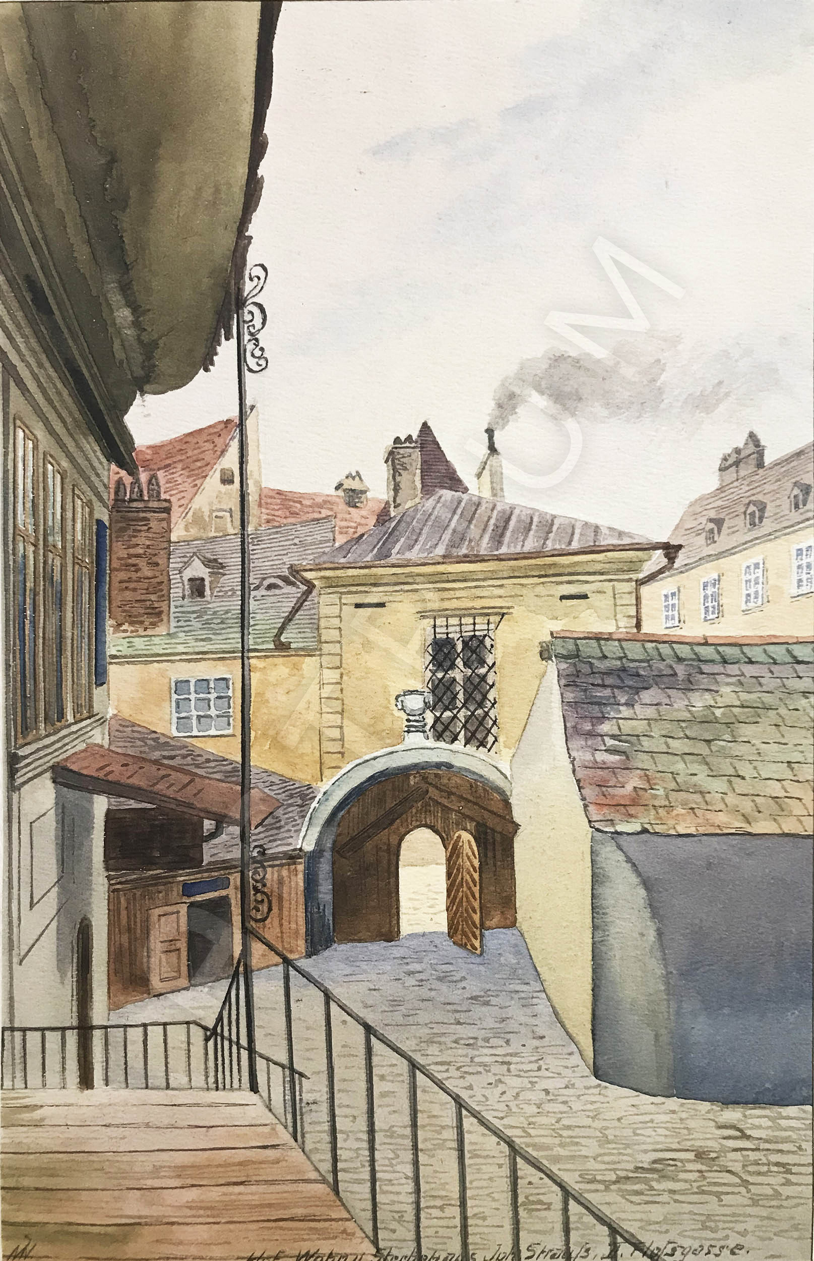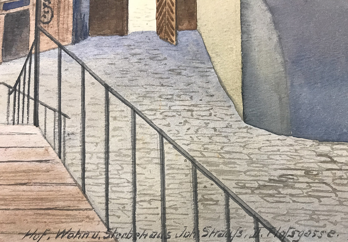 - monogrammiert: "MN", betitelt: "Hof Wohn u. Sterbehaus Joh. Strauß, II Floßgasse"