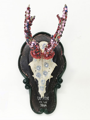 Susanne Riegelnik Trophy 16 Mixed media, diamond dust, glass crystals on hunting trophy 27 cm € 300.-